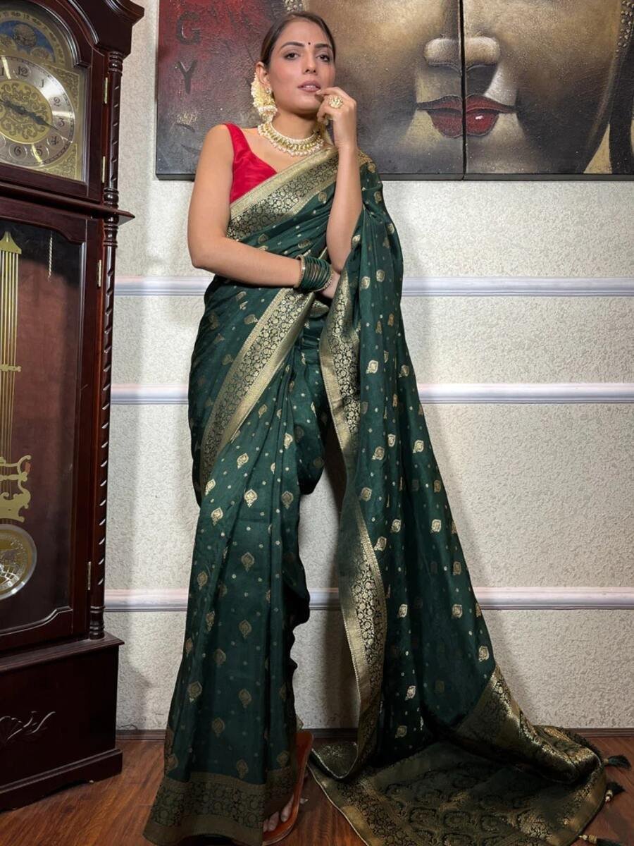 FASHIONABLE BANARASI SOFT SILK WEAVING WORK SAREE WITH UNSTITCHED BLOUSE GREEN