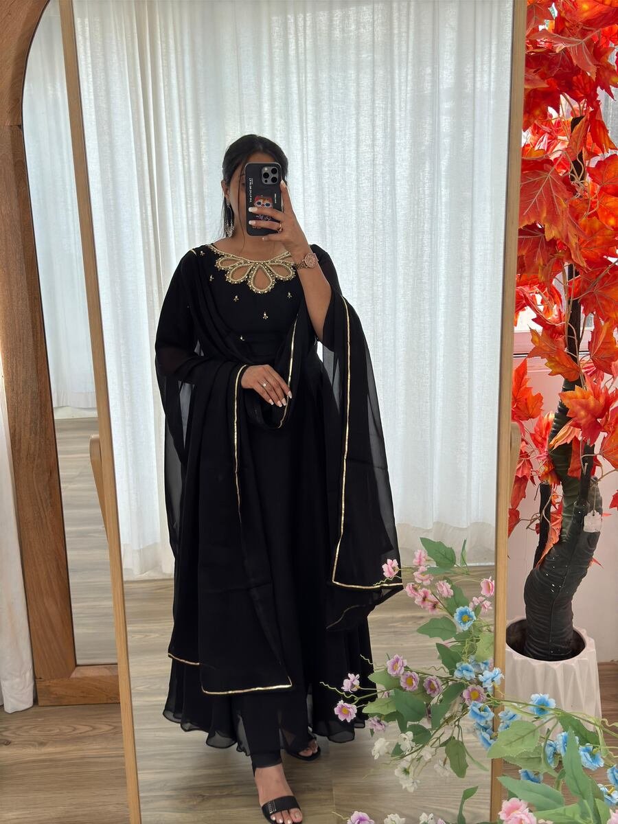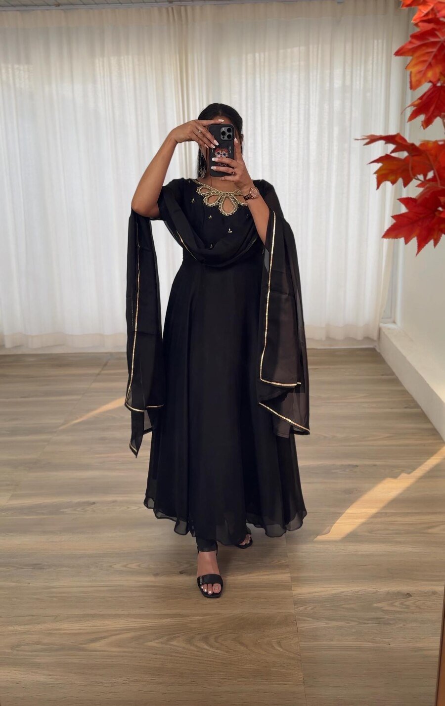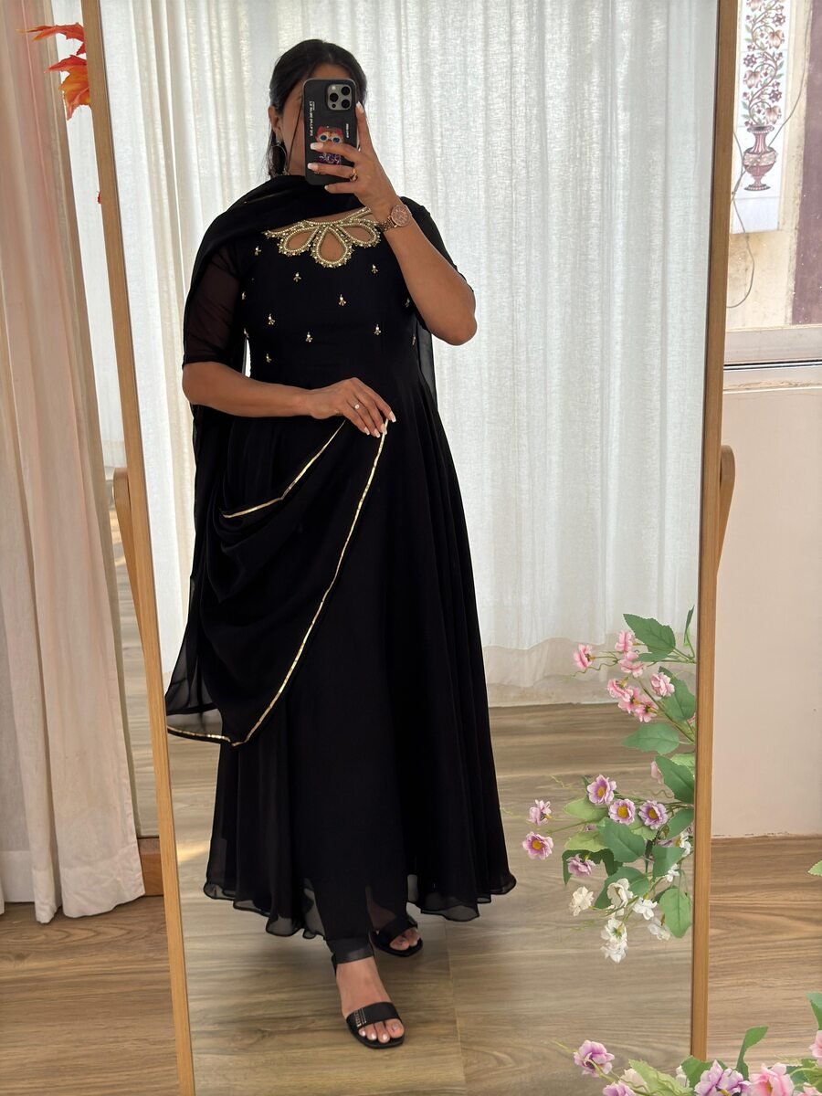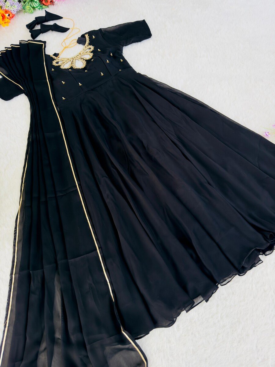 FASHIONABLE BLACK RANGOLI GEORGETTE EMBROIDERY NECK DESIGNER GOWN WITH DUPATTA BLACK