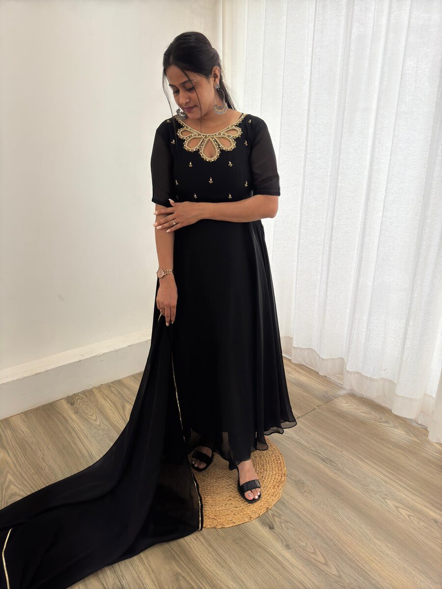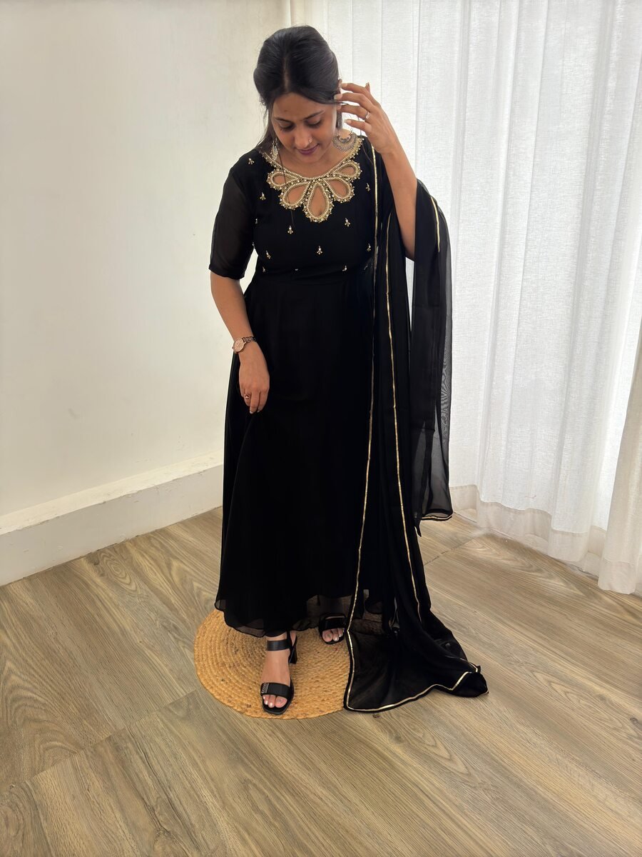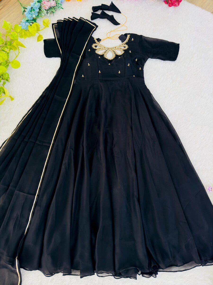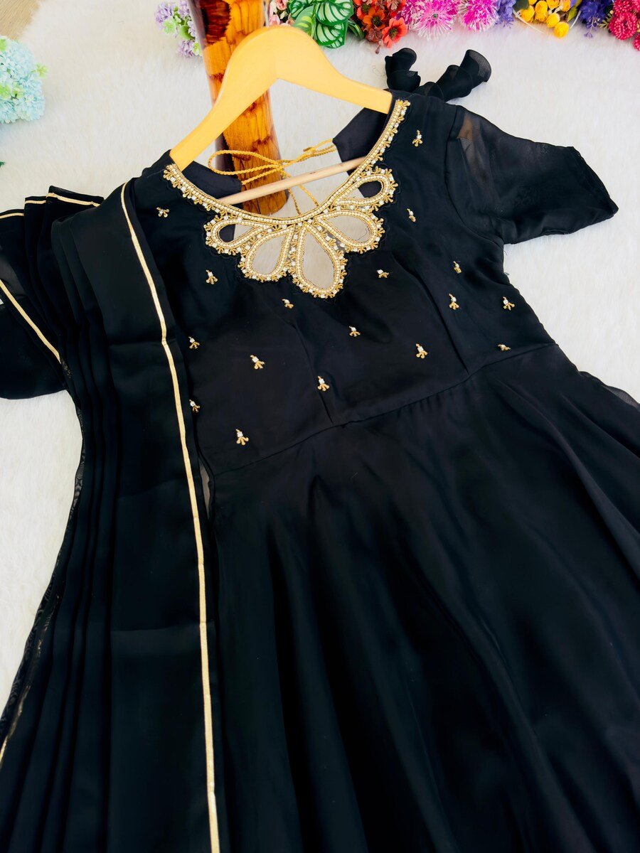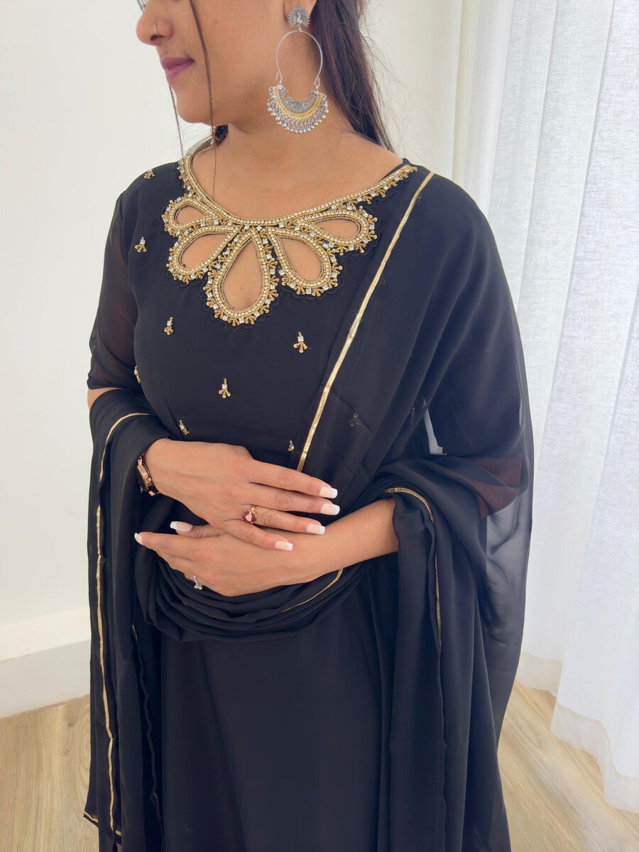 FASHIONABLE BLACK RANGOLI GEORGETTE EMBROIDERY NECK DESIGNER GOWN WITH DUPATTA BLACK