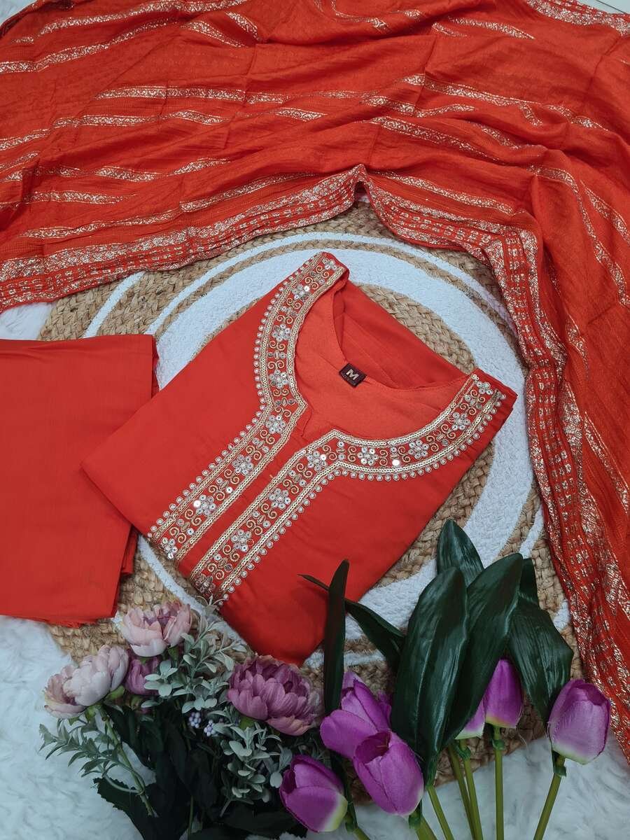 FASHIONABLE CHANDERI SILK EMBROIDERY SEQUENCE CODING WORK TOP BOTTOM WITH DUPATTA ORANGE
