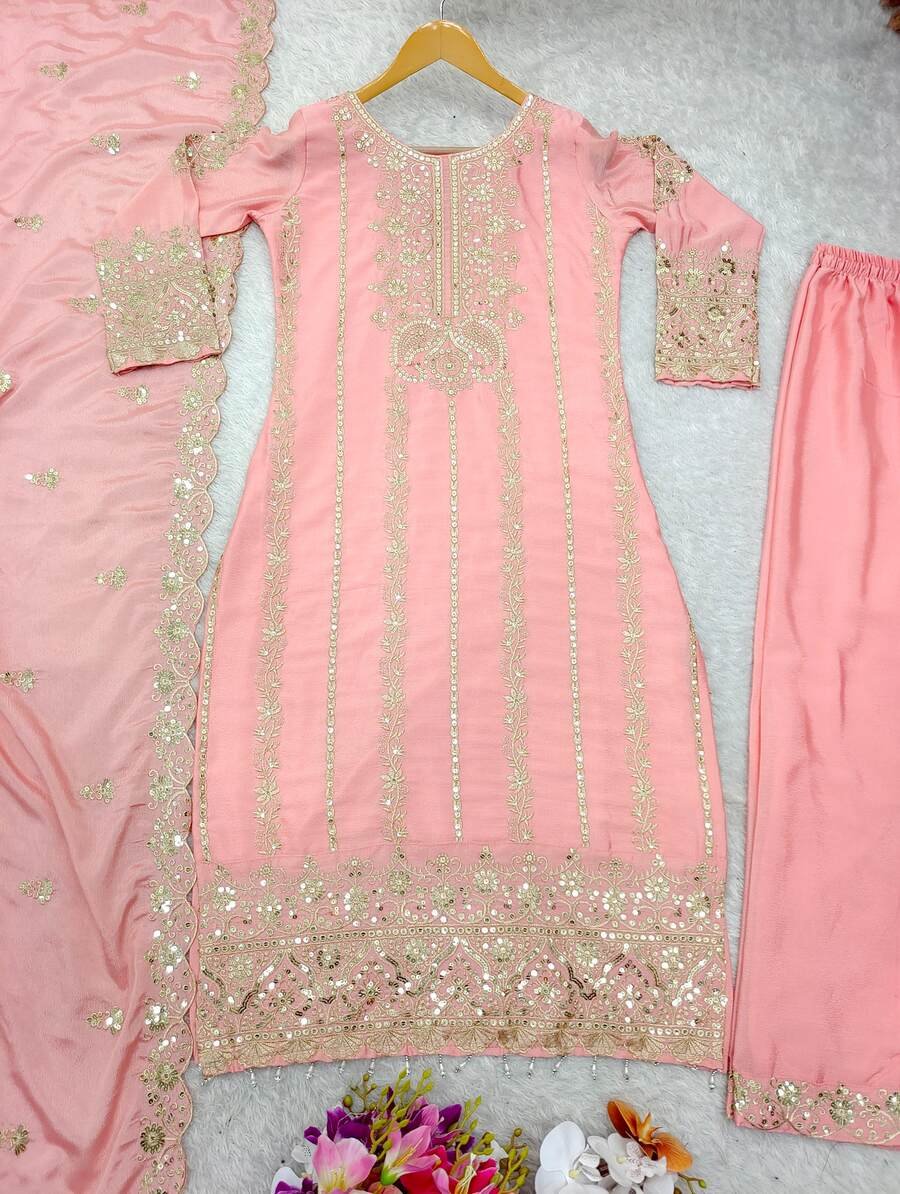 FASHIONABLE CHINON SILK EMBROIDERY SEQUENCE MOTI WORK TOP BOTTOM WITH DUPATTA BABY PINK