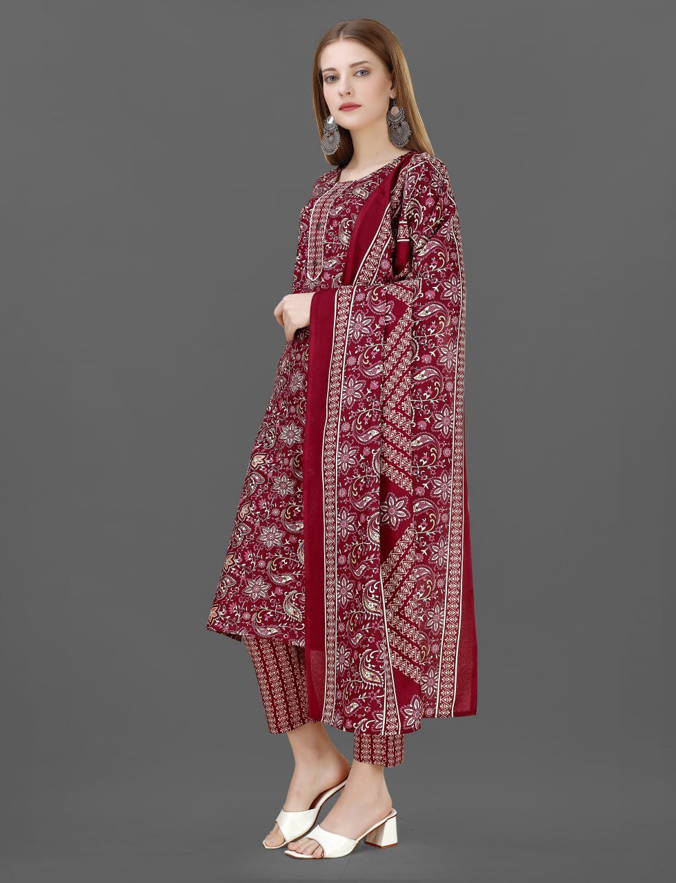 FASHIONABLE COTTON BLEND PRINT WORK TOP BOTTOM WITH DUPATTA RED