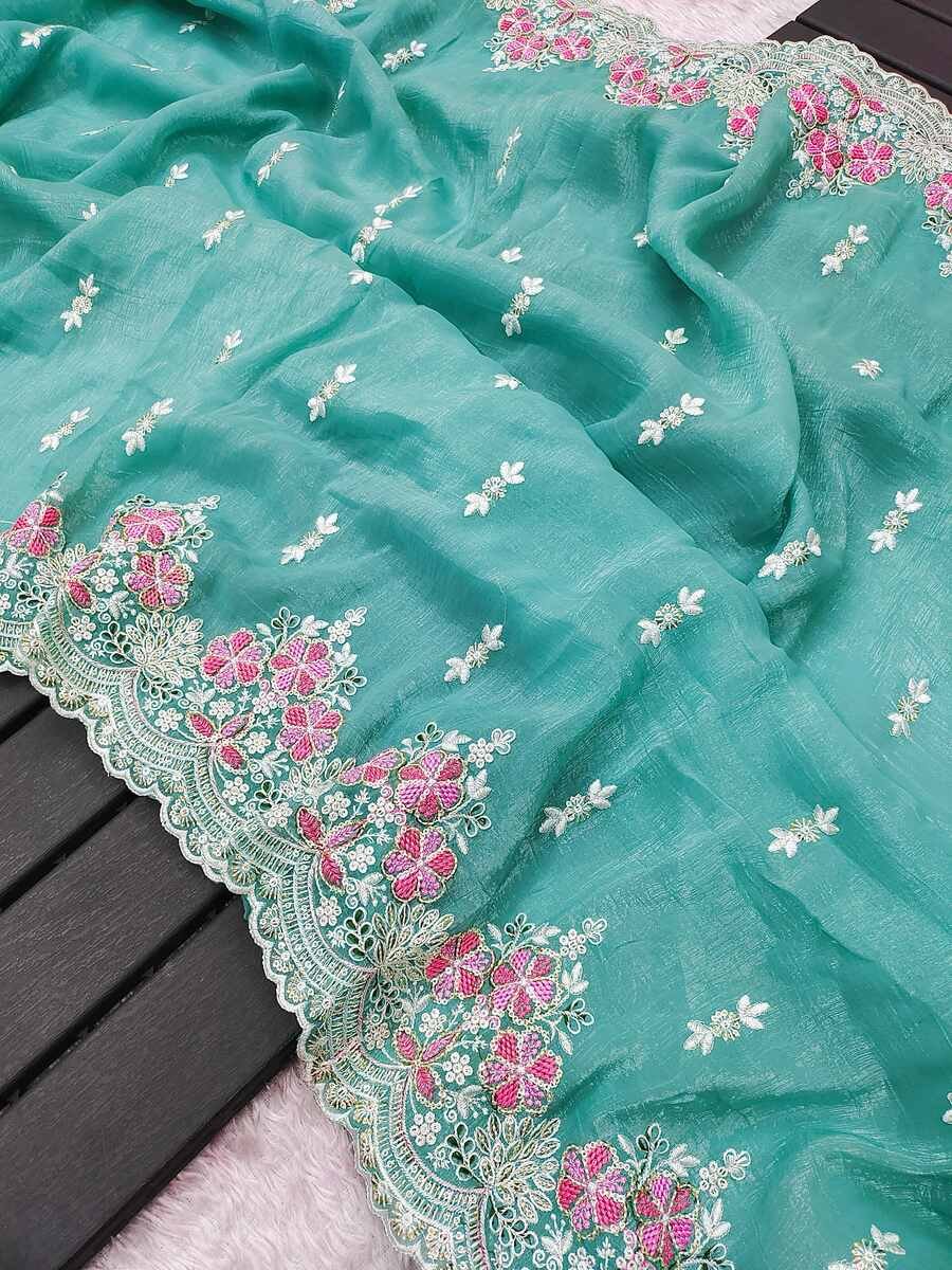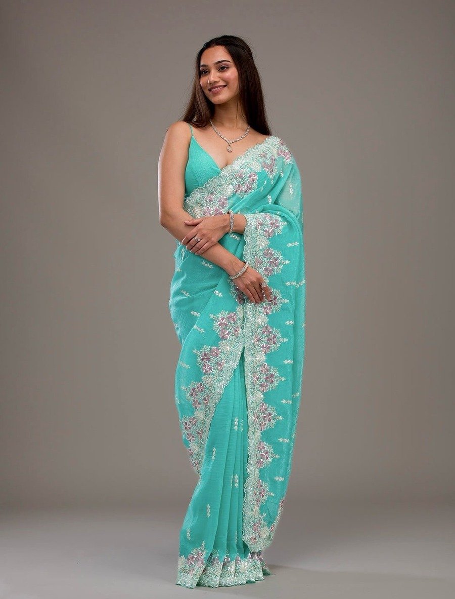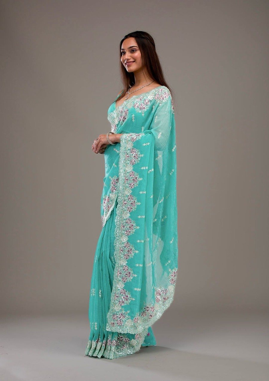 SAREE FABRIC :- CRUNCHY WITH HEAVY EMBROIDERY THREADS & SEQUENCE WORK WITH FANCY CUT WORK BORDER