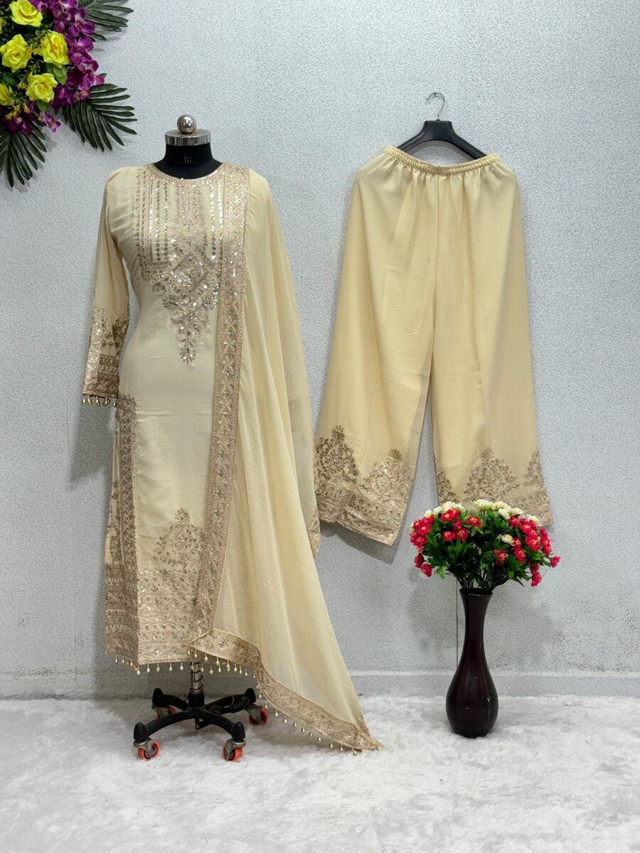 FASHIONABLE GEORGETTE CHINE STITCH SEQUENCE WORK TOP PALAZZO WITH DUPATTA CREAM