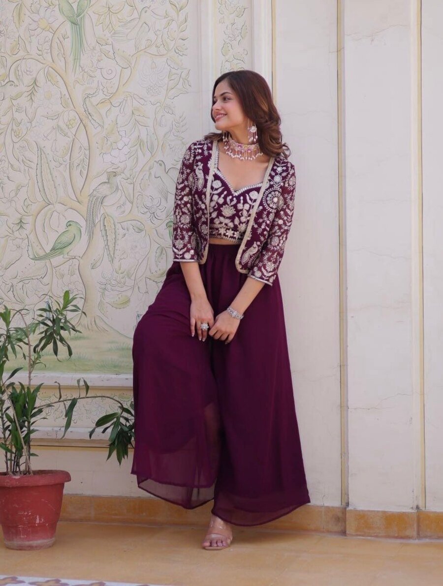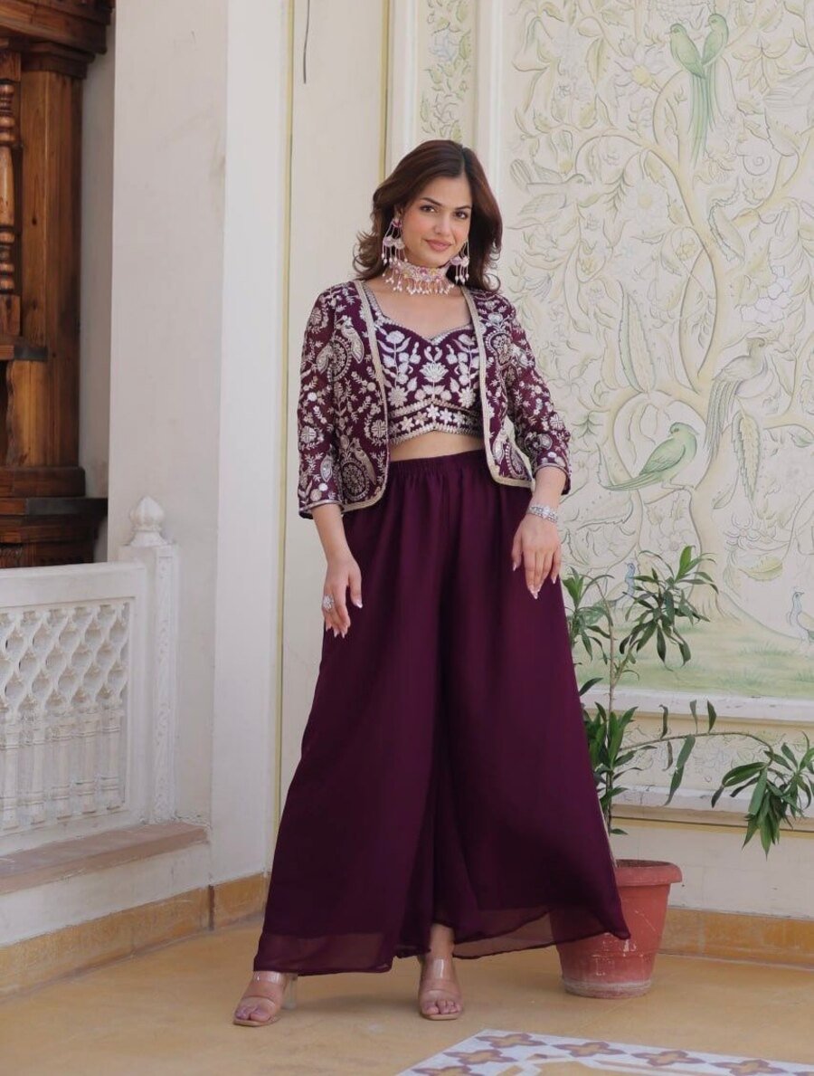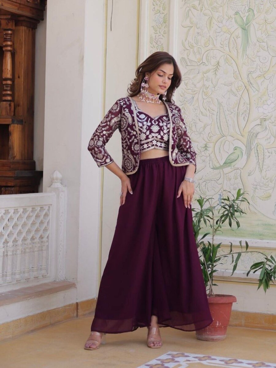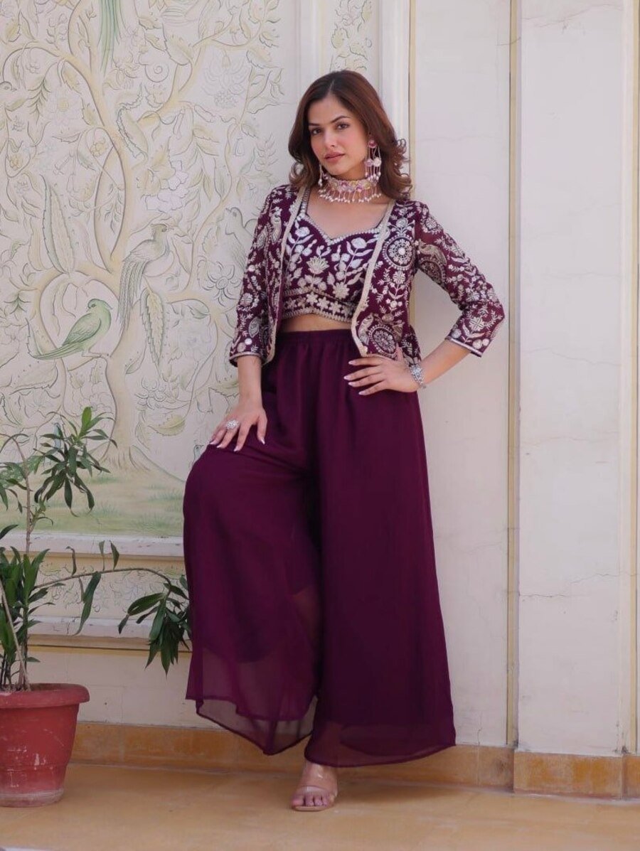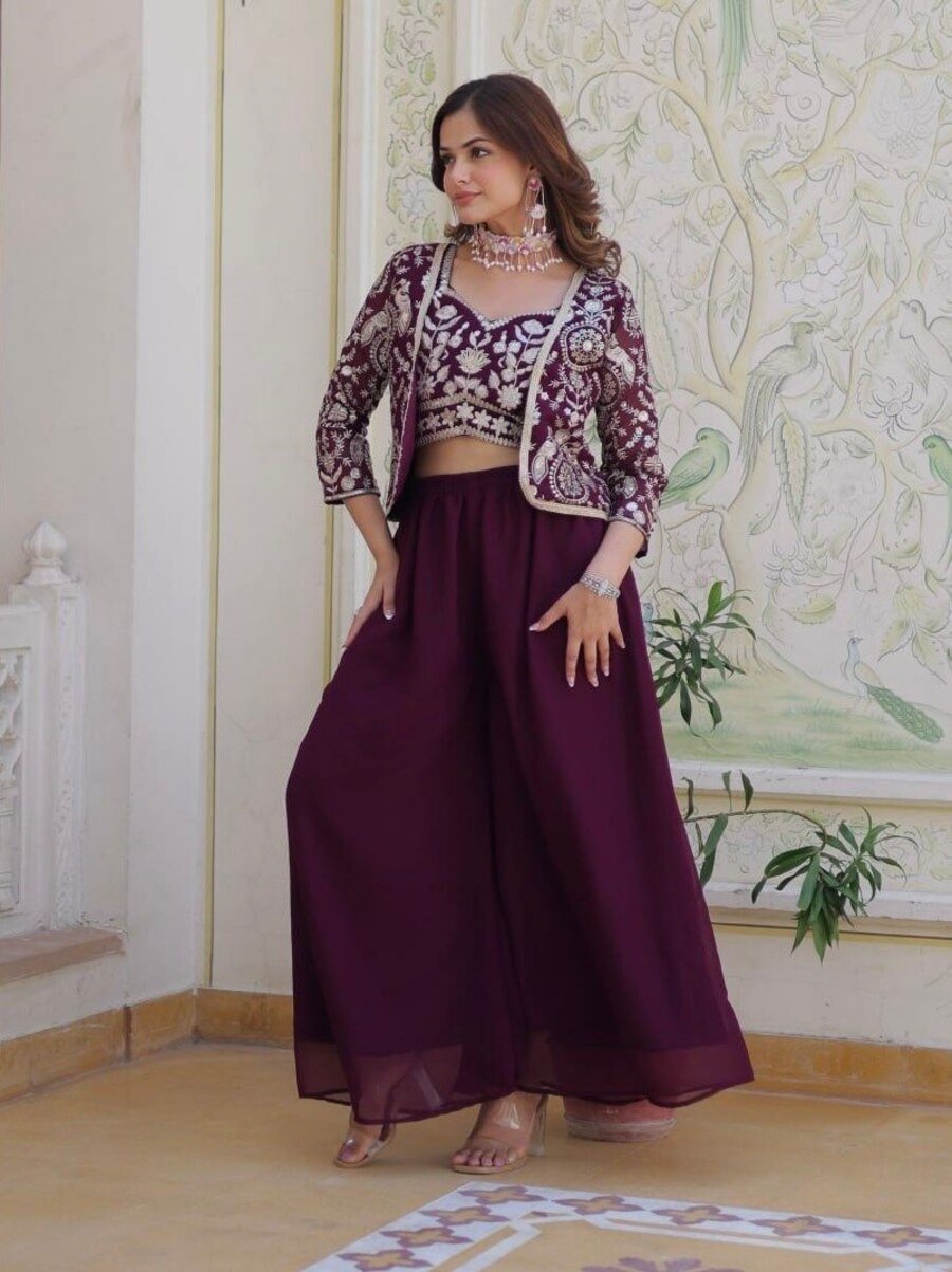 FASHIONABLE GEORGETTE EMBROIDERY SEQUENCE WORK PALAZZO CHOLI WITH KOTI WINE