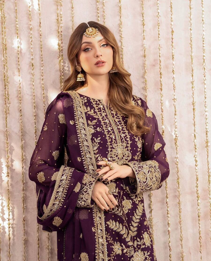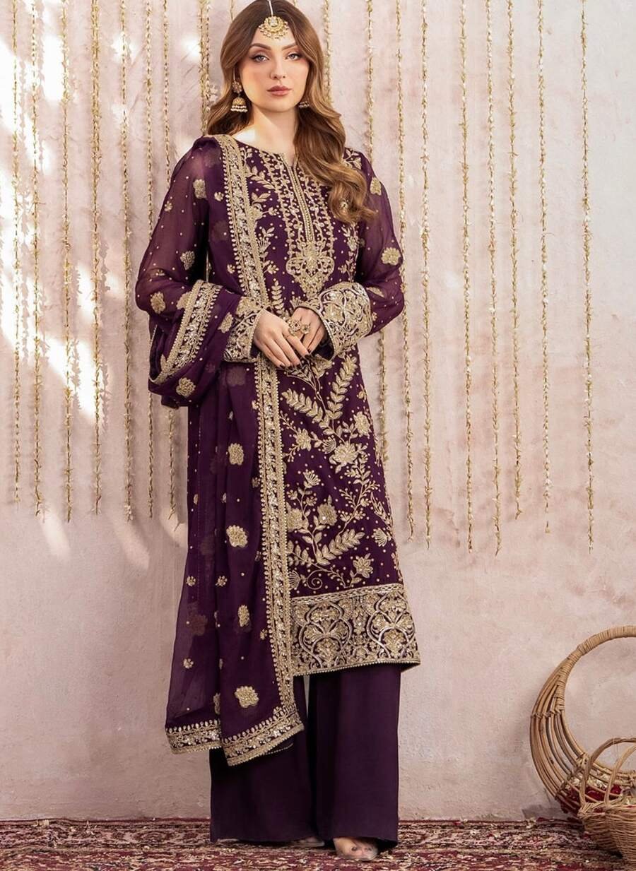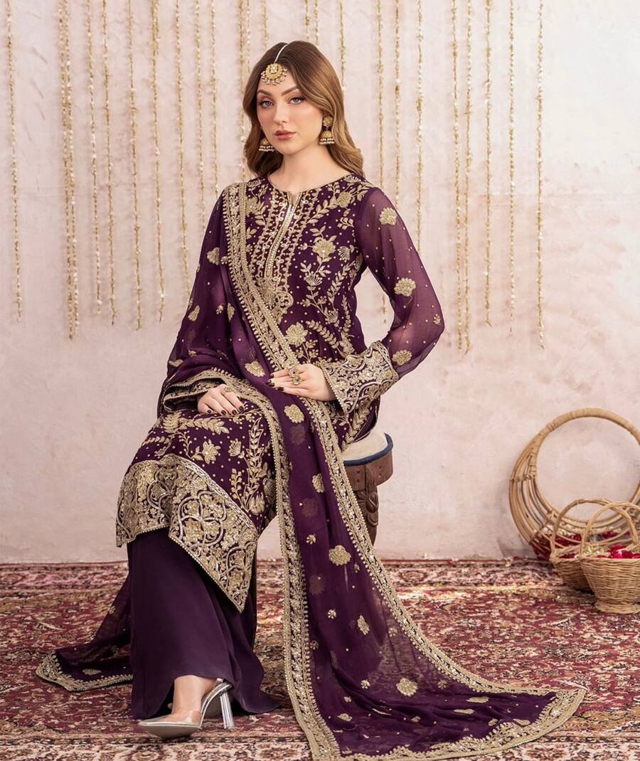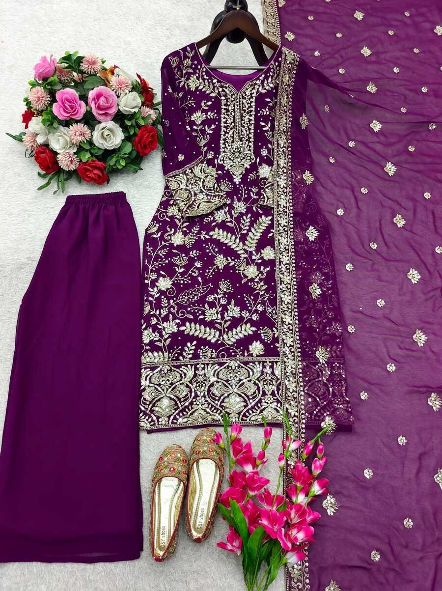 FASHIONABLE GEORGETTE EMBROIDERY SEQUENCE WORK TOP PALAZZO WITH DUPATTA PURPLE