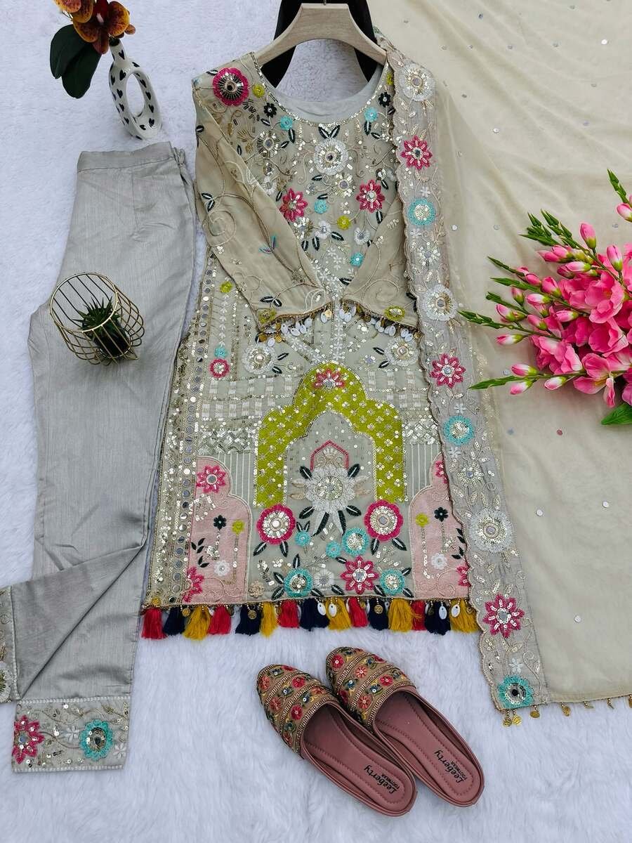FASHIONABLE GEORGETTE EMBROIDERY THREAD SEQUENCE WORK TOP BOTTOM WITH DUPATTA OFF WHITE
