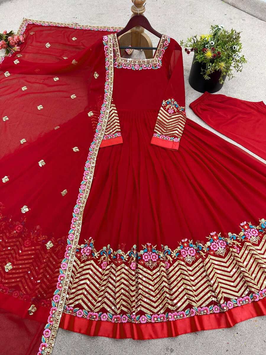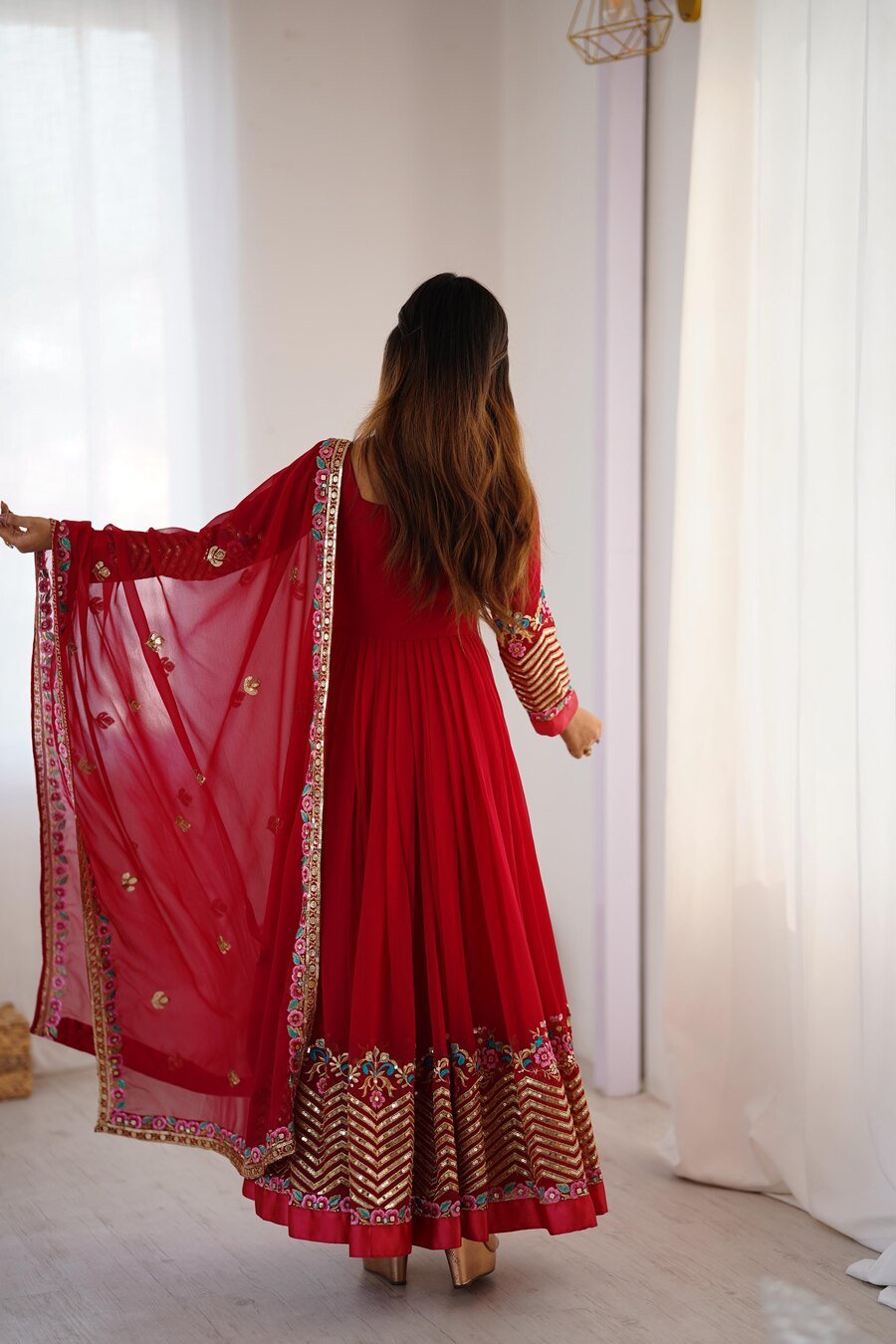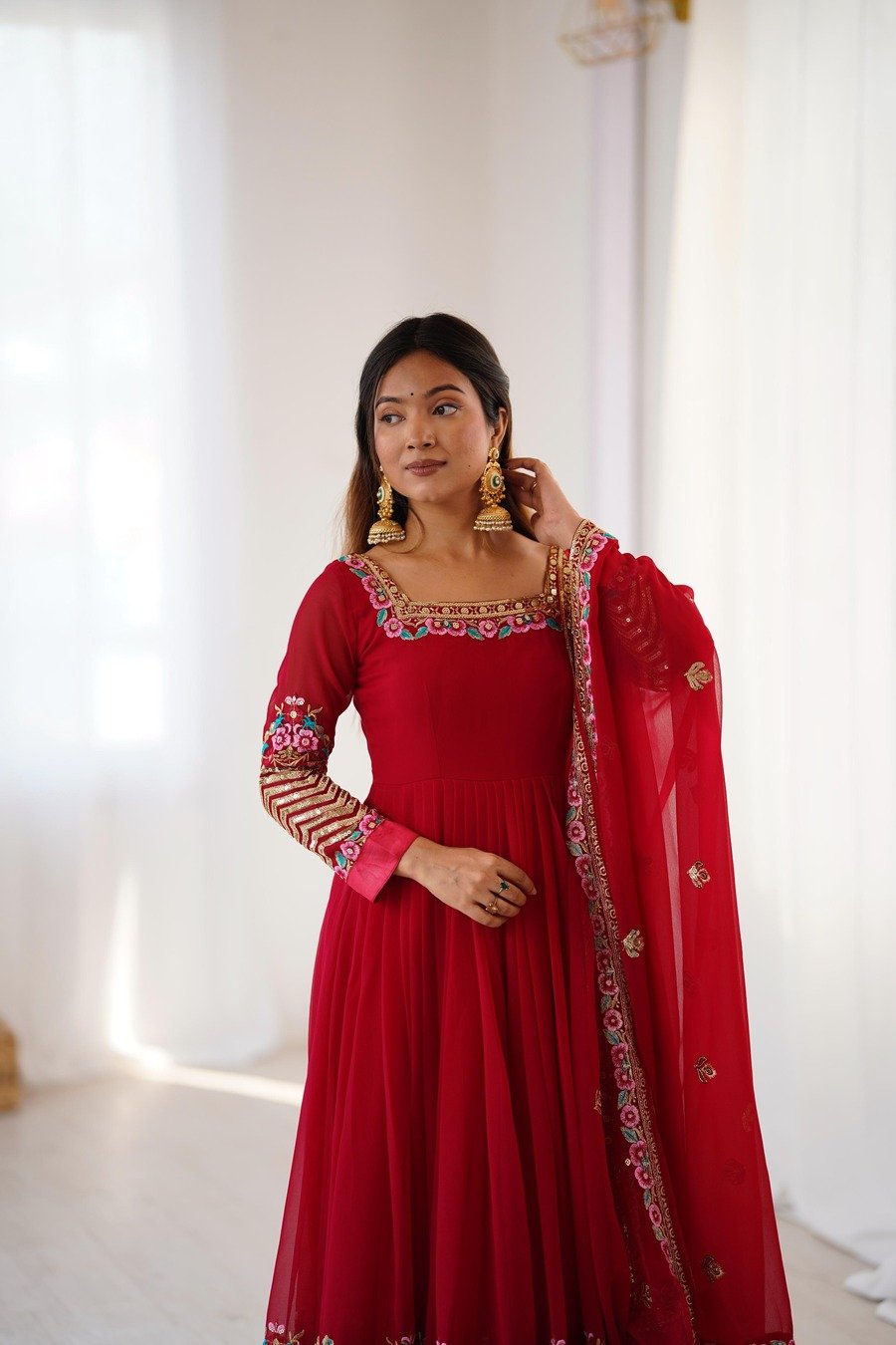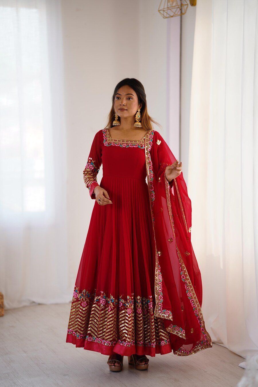 FASHIONABLE GEORGETTE MULTI THREAD HEAVY EMBROIDERY SEQUENCE WORK GOWN BOTTOM WITH DUPATTA RED