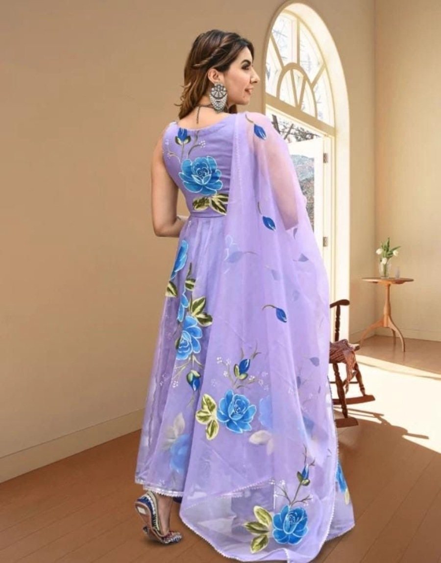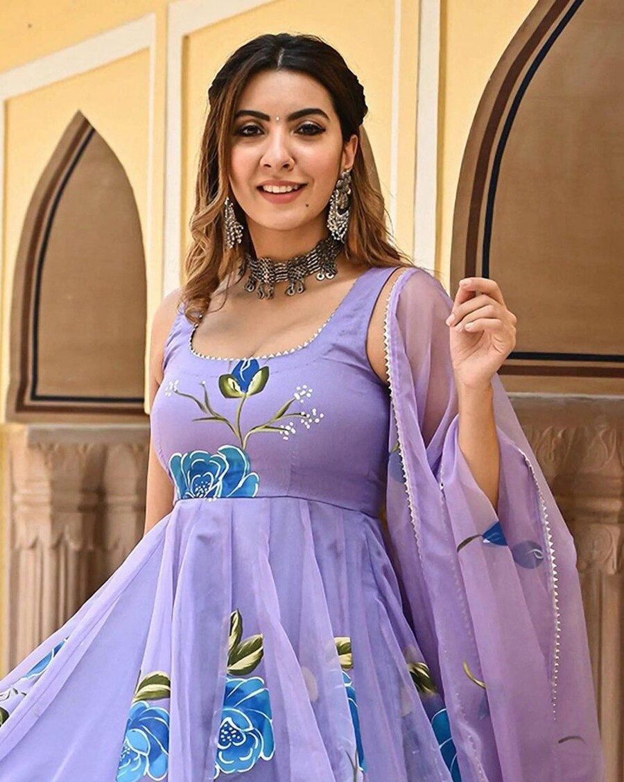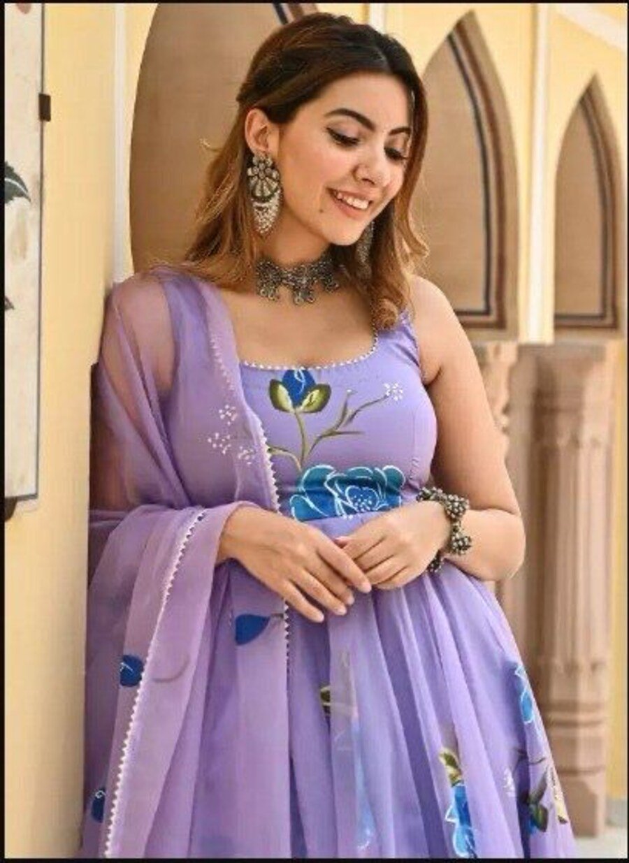 FASHIONABLE GEORGETTE PRINTED GOWN WITH DUPATTA LAVENDER