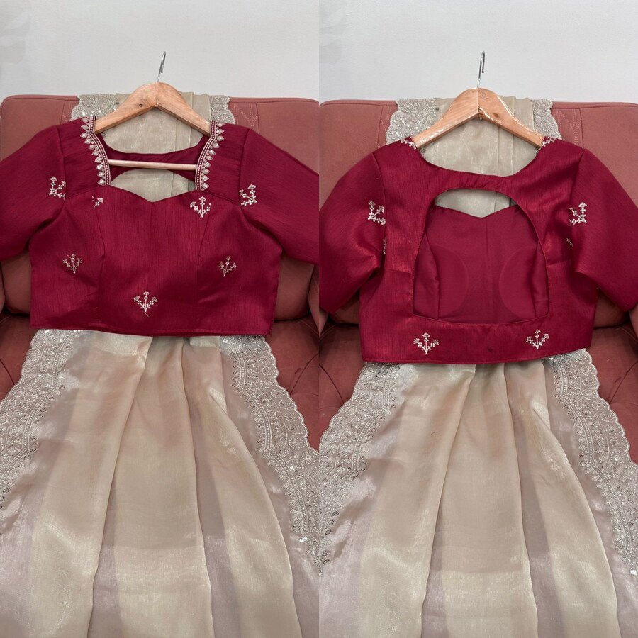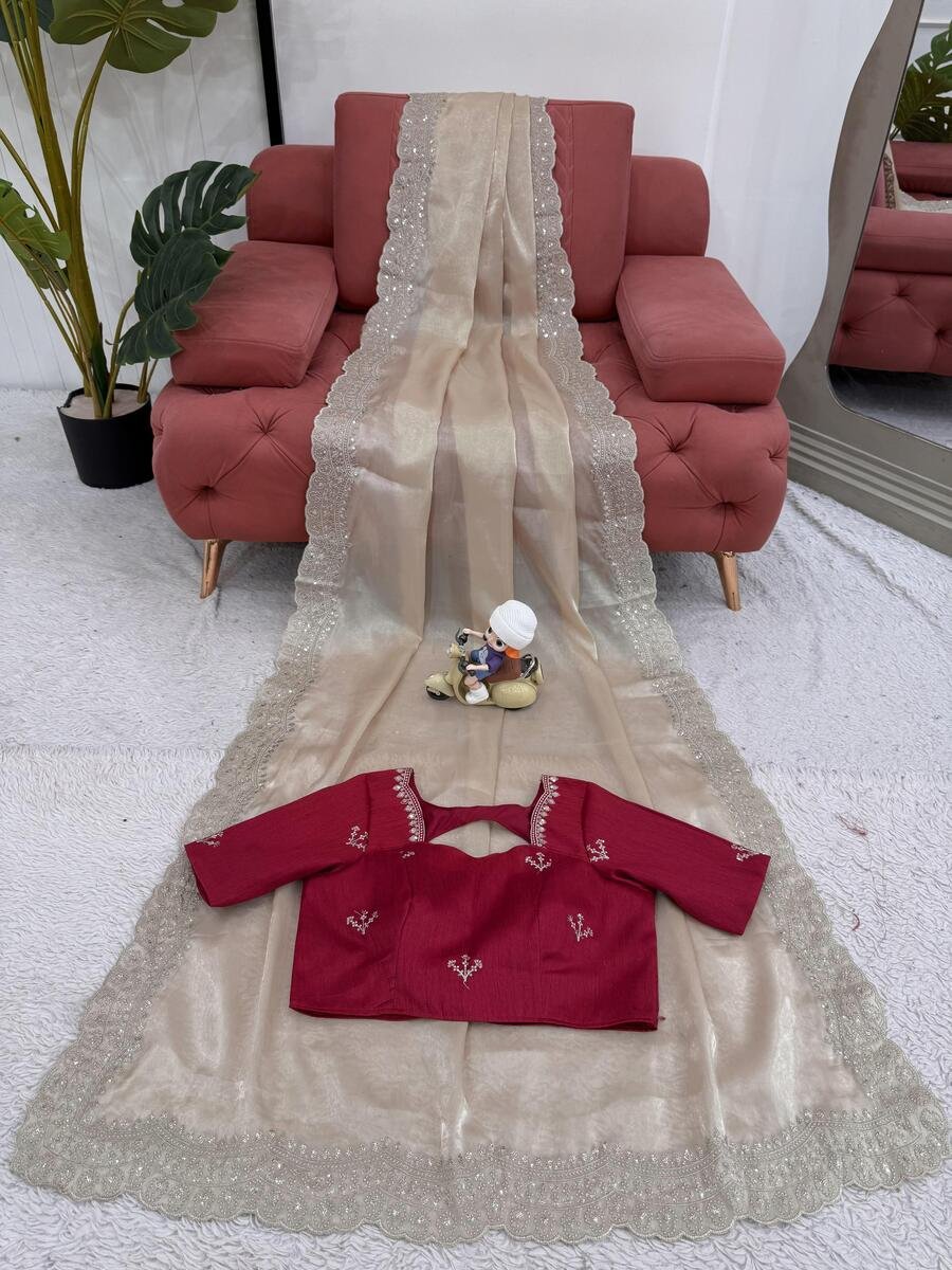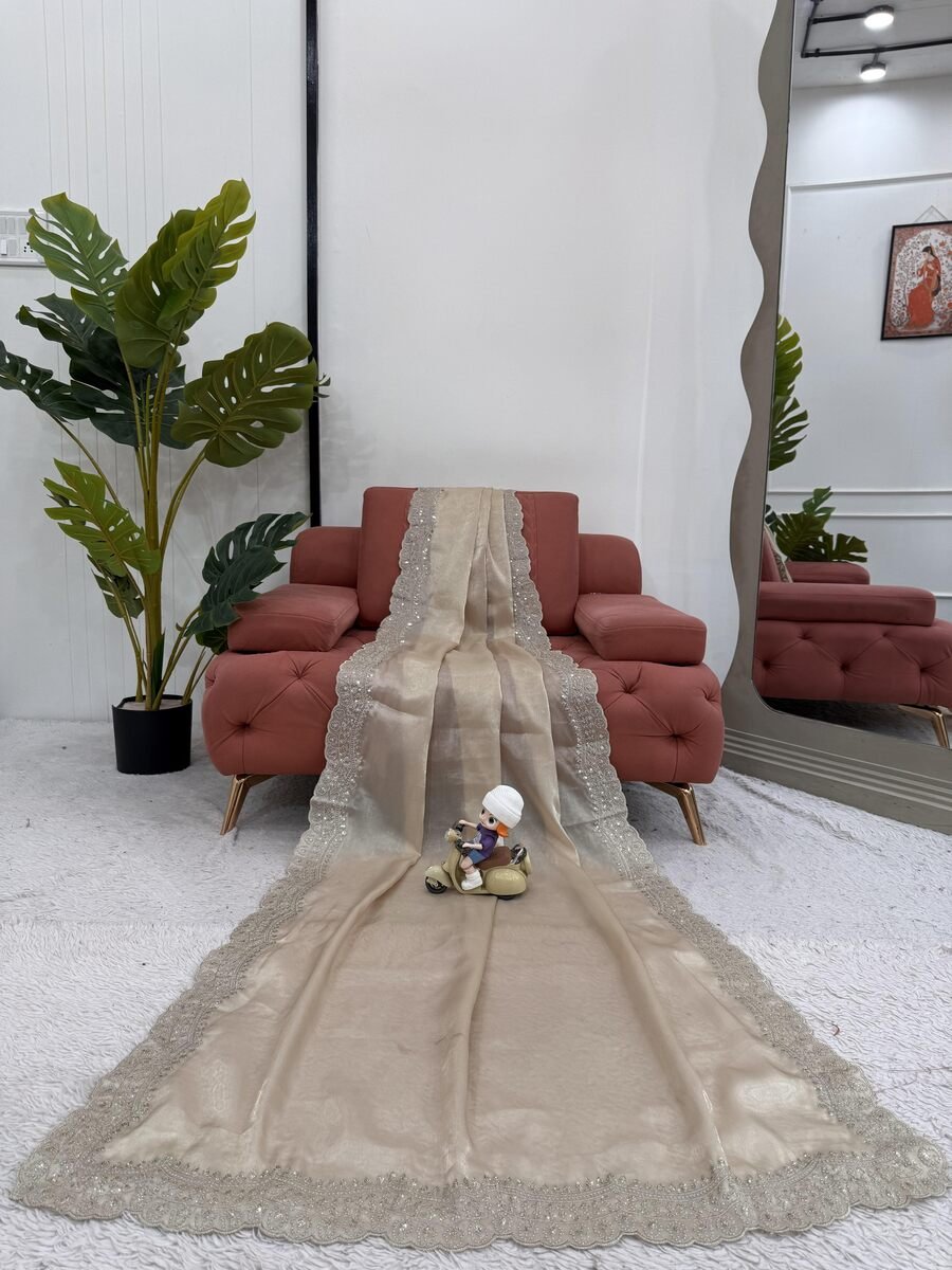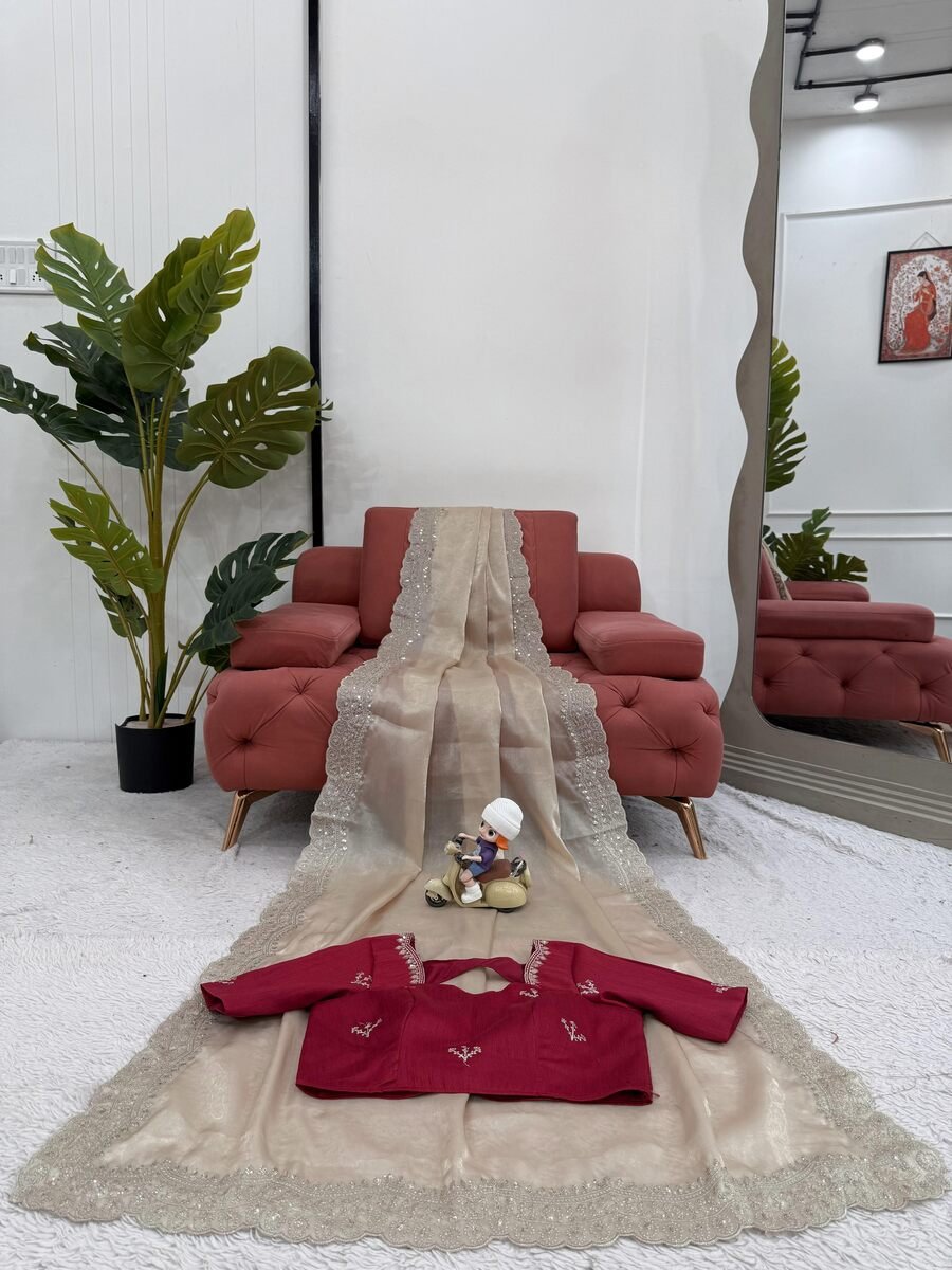 FASHIONABLE JIMMY CHOO THREAD SEQUENCE WORK SAREE WITH UNSTITCHED BLOUSE CREAM