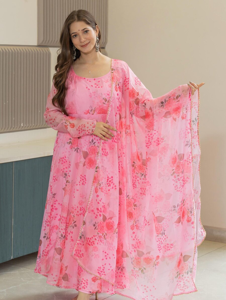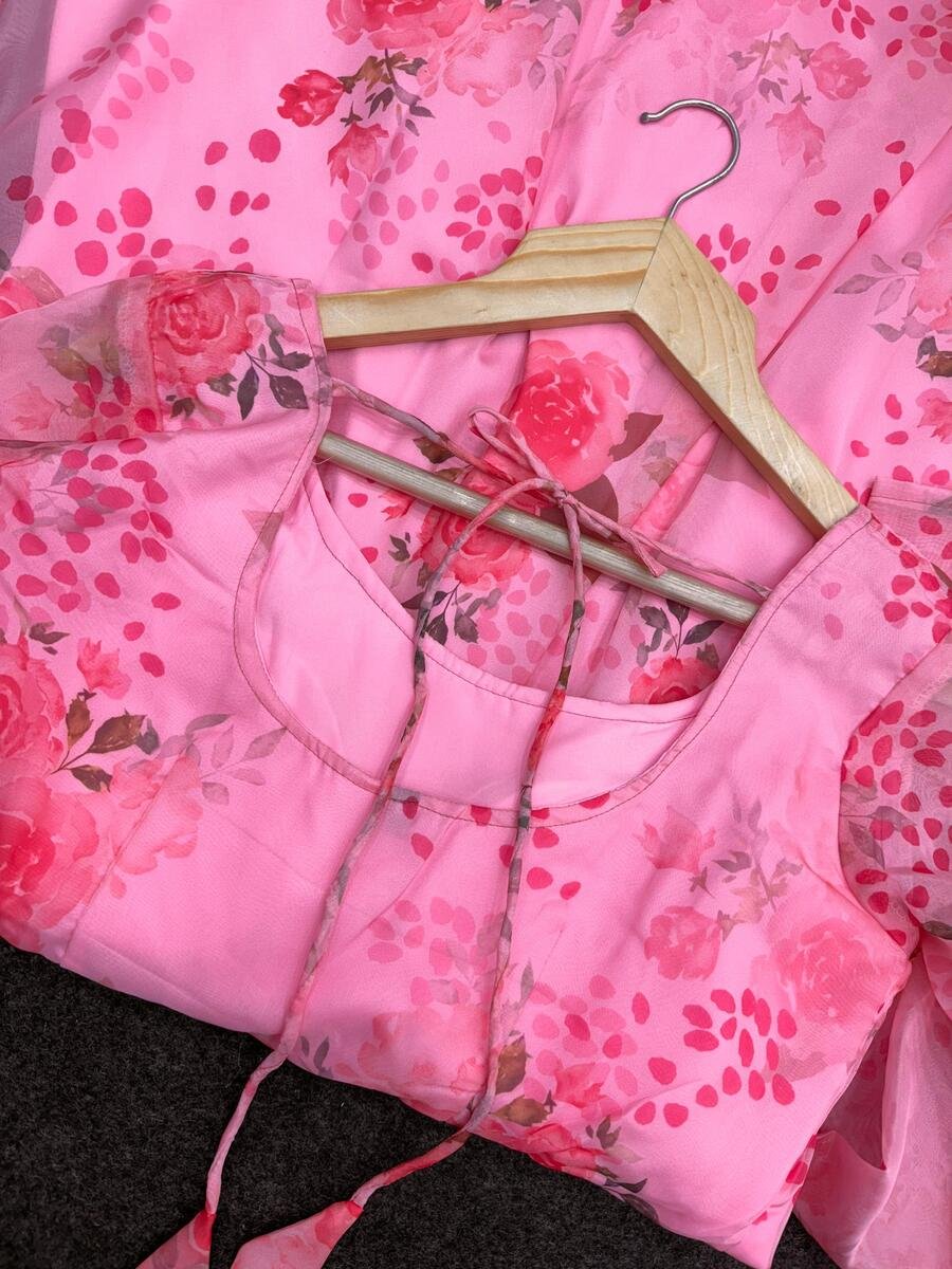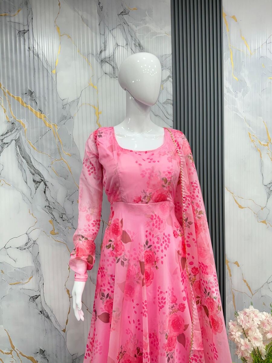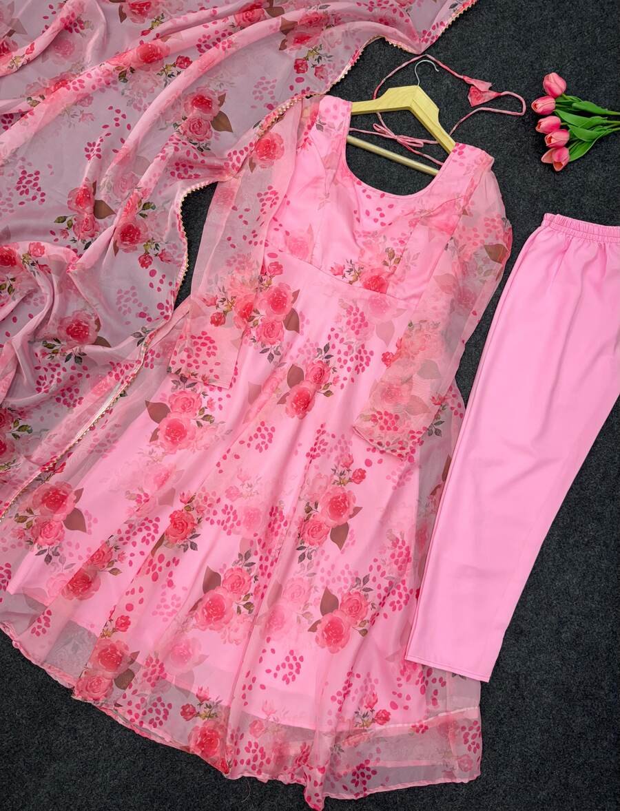 FASHIONABLE ORGANZA FLORAL PRINT WORK ANARKALI BOTTOM WITH DUPATTA PINK