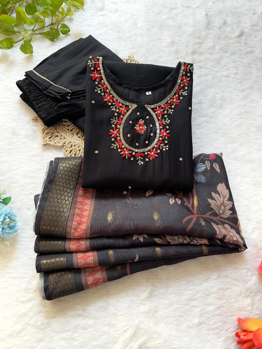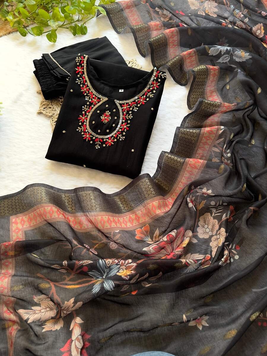 FASHIONABLE SOFT SILK THREAD SEQUENCE HAND WORK TOP BOTTOM WITH DUPATTA BLACK