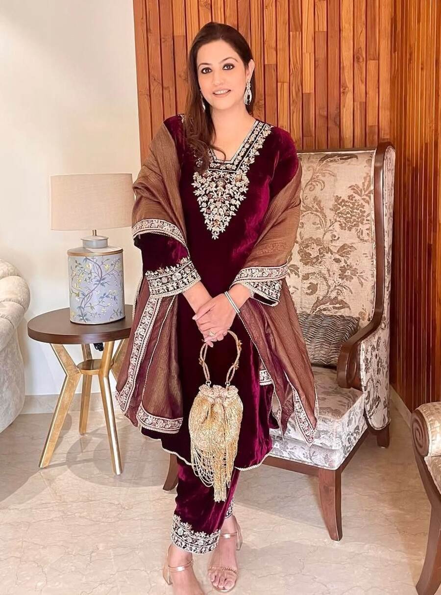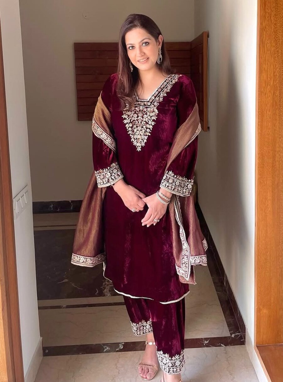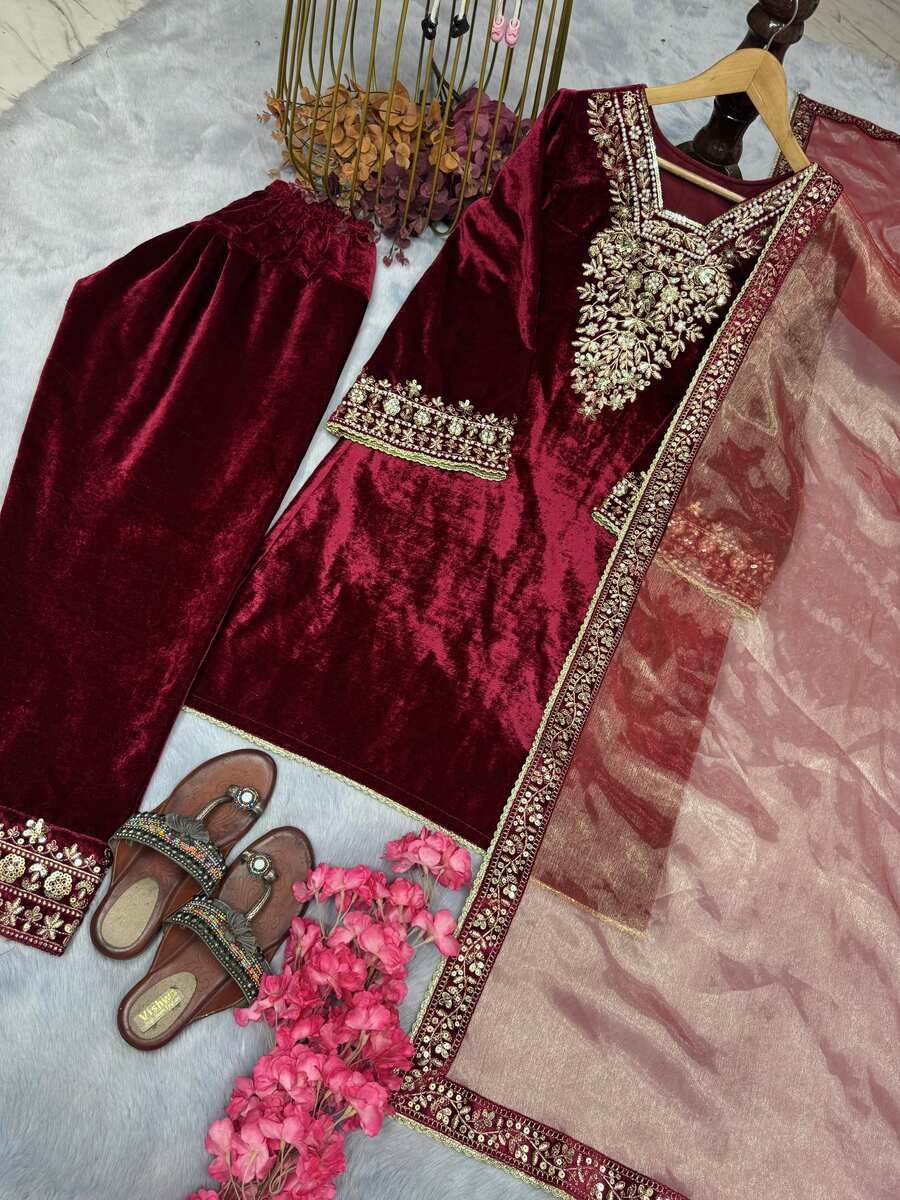 FASHIONABLE VELVET EMBROIDERY SEQUENCE WORK TOP BOTTOM WITH DUPATTA MAROON