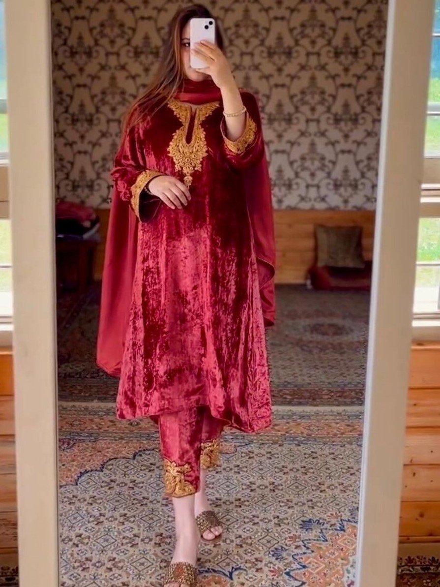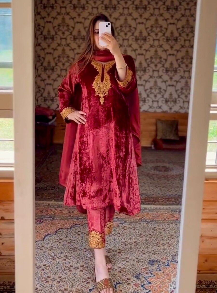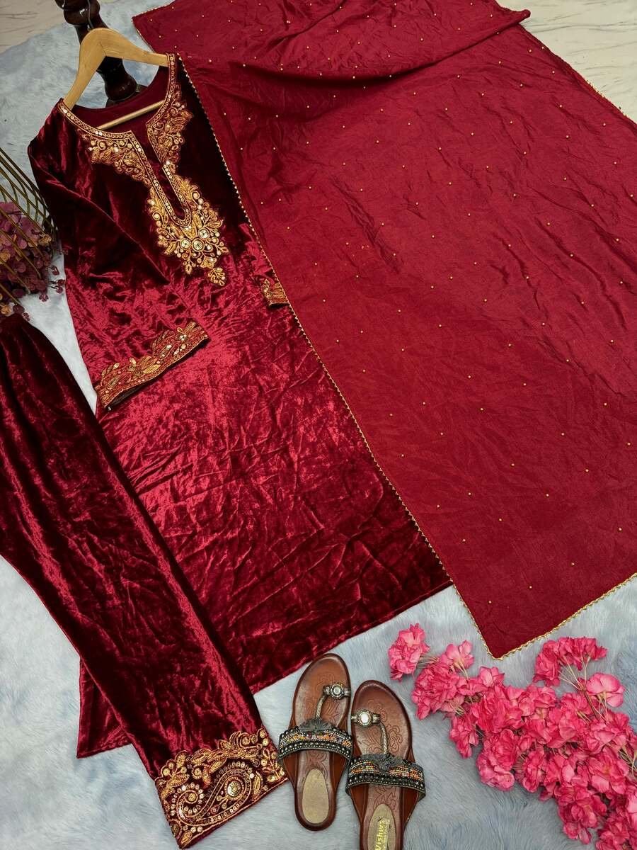 FASHIONABLE VELVET EMBROIDERY SEQUENCE WORK TOP BOTTOM WITH DUPATTA MAROON