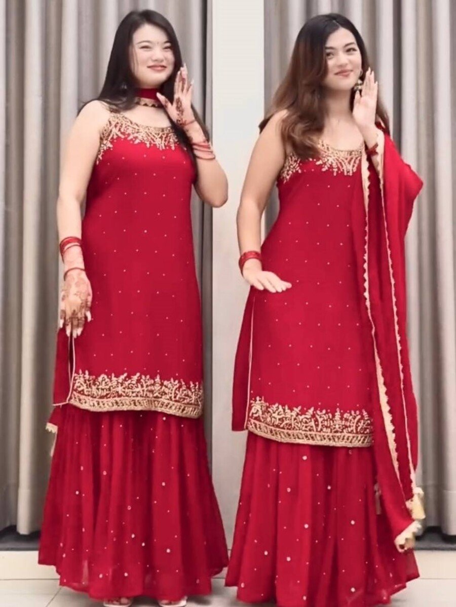 GEORGETTE EMBROIDERY SEQUENCE WORK WITH RIVET MOTI WORK HAND WORK TOP SHARARA WITH DUPATTA RED