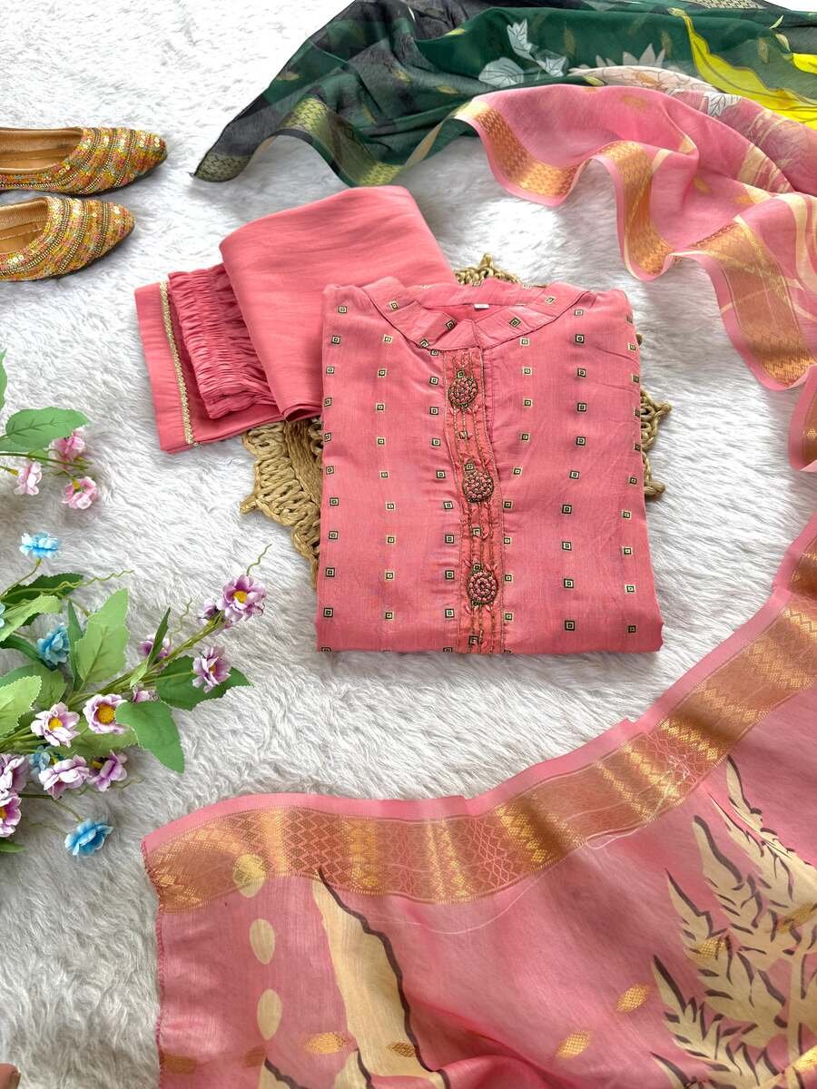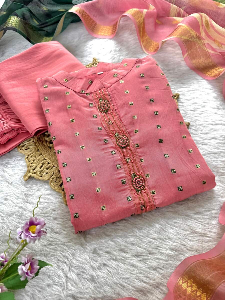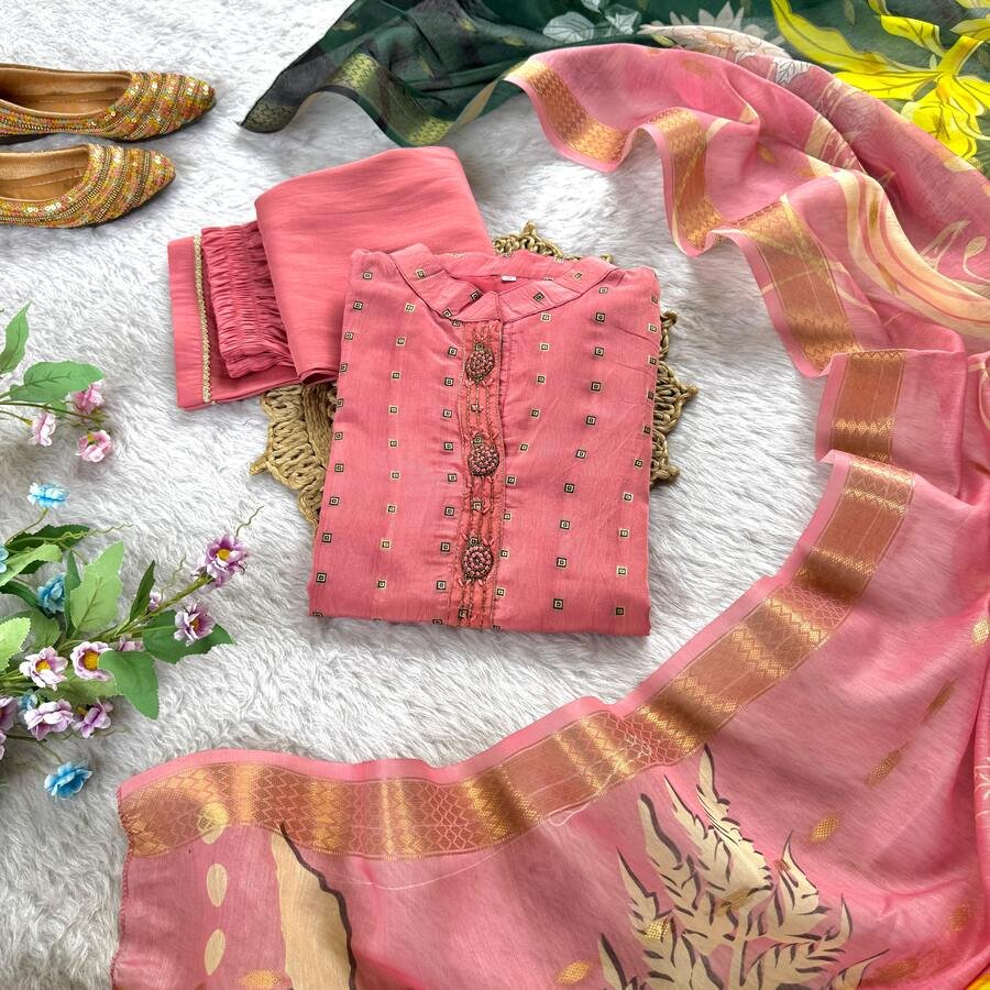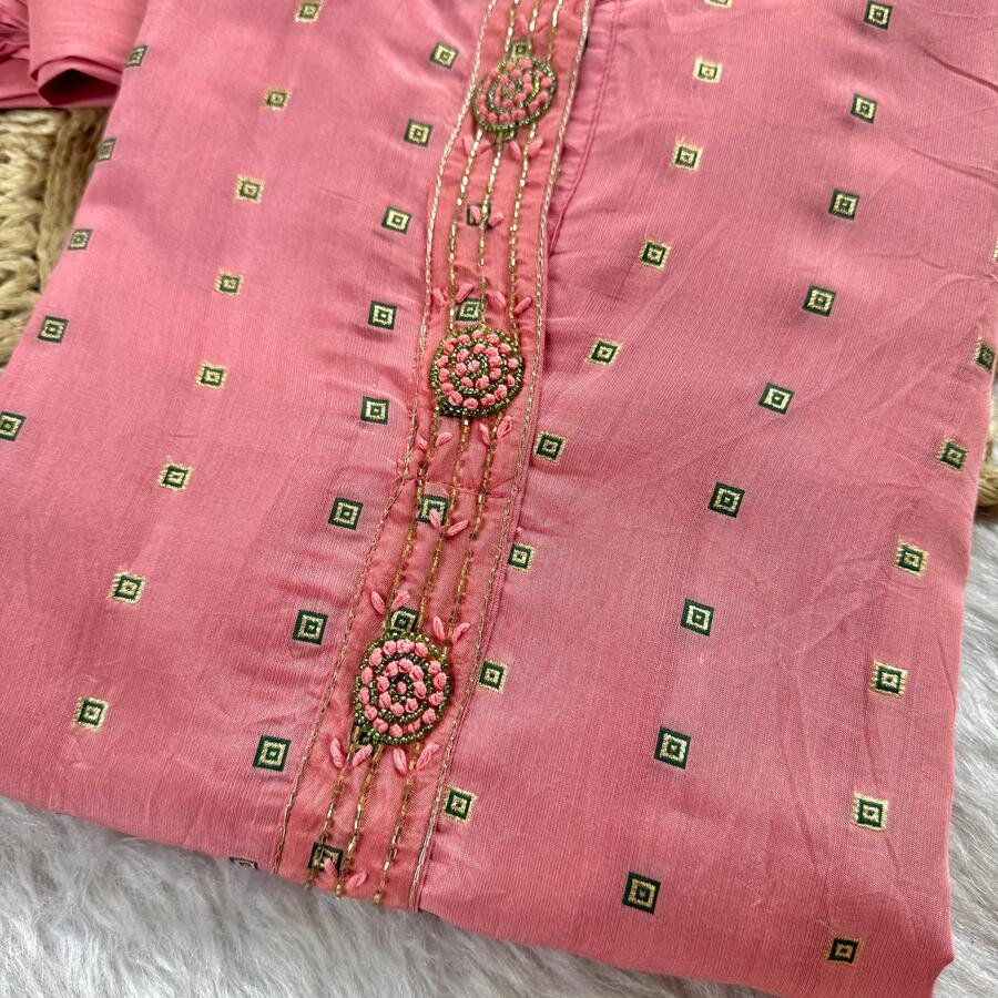 GORGEOUS JACQUARD COTTON HANDWORK KURTI PENT WITH DUPATTA BABY PINK