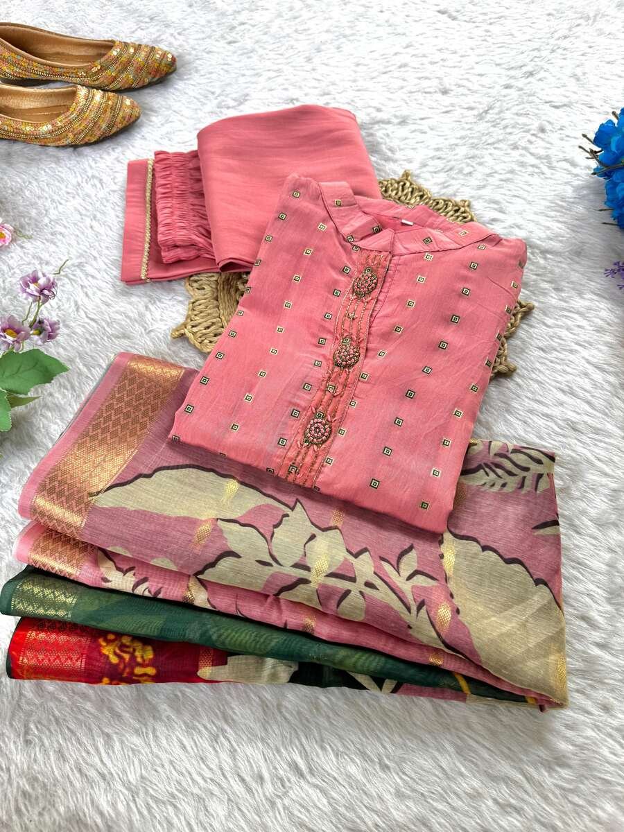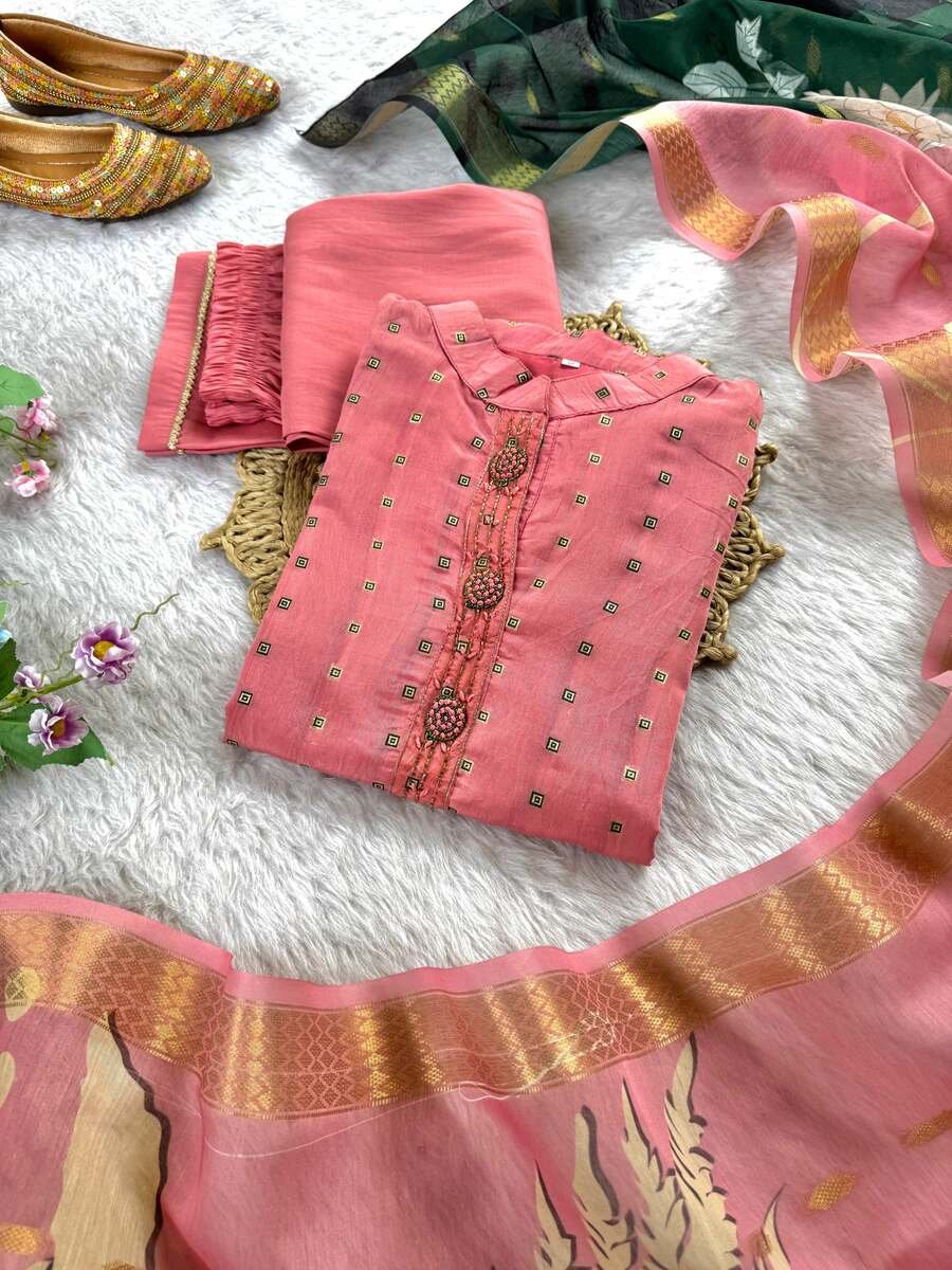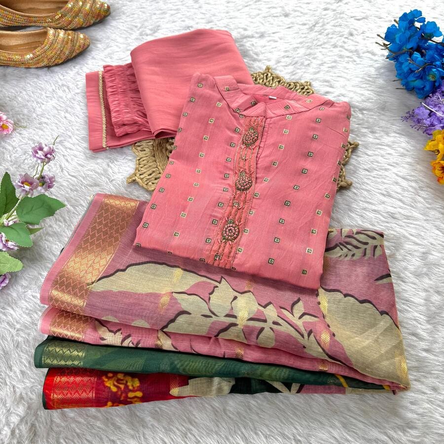 GORGEOUS JACQUARD COTTON HANDWORK KURTI PENT WITH DUPATTA BABY PINK