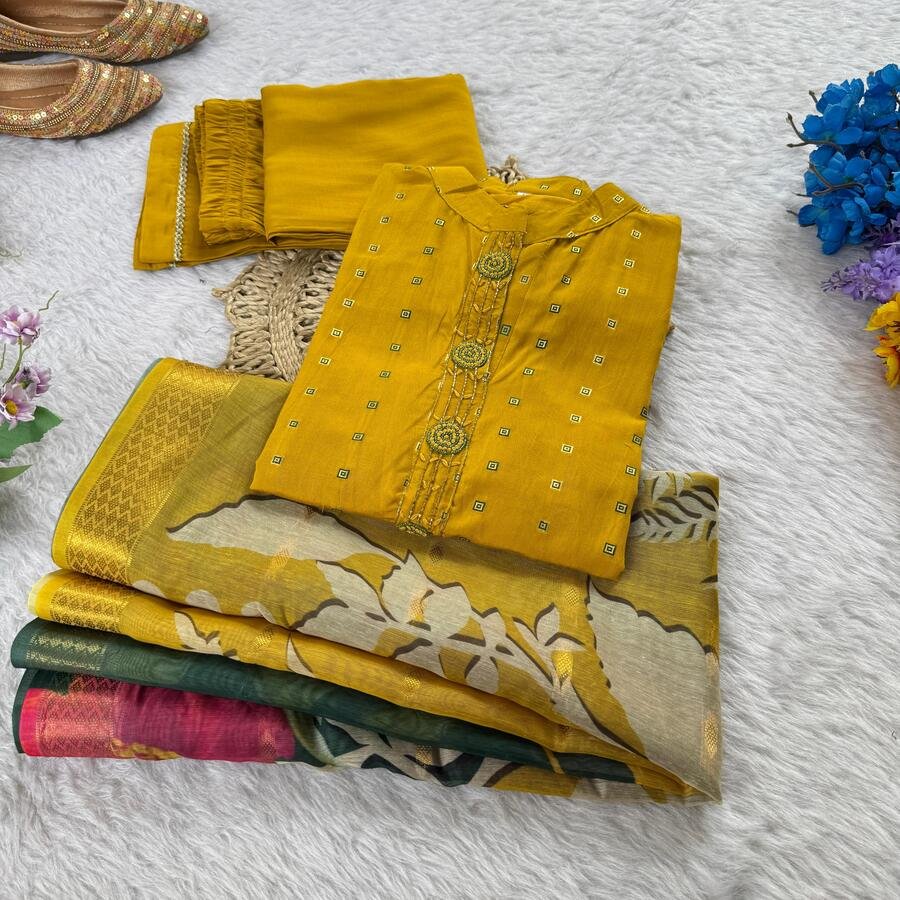 LATEST CHANDERI HAND WORK AND THREAD WORK TOP BOTTOM WITH DUPATTA YELLOW