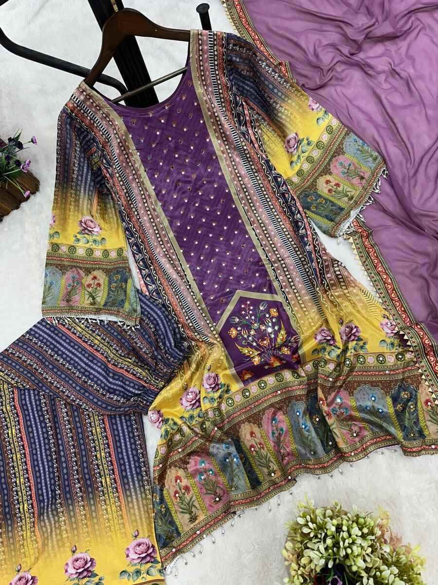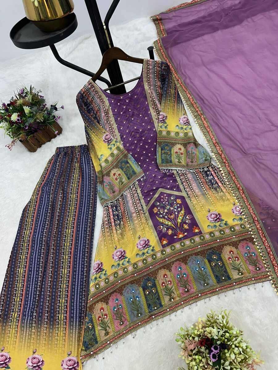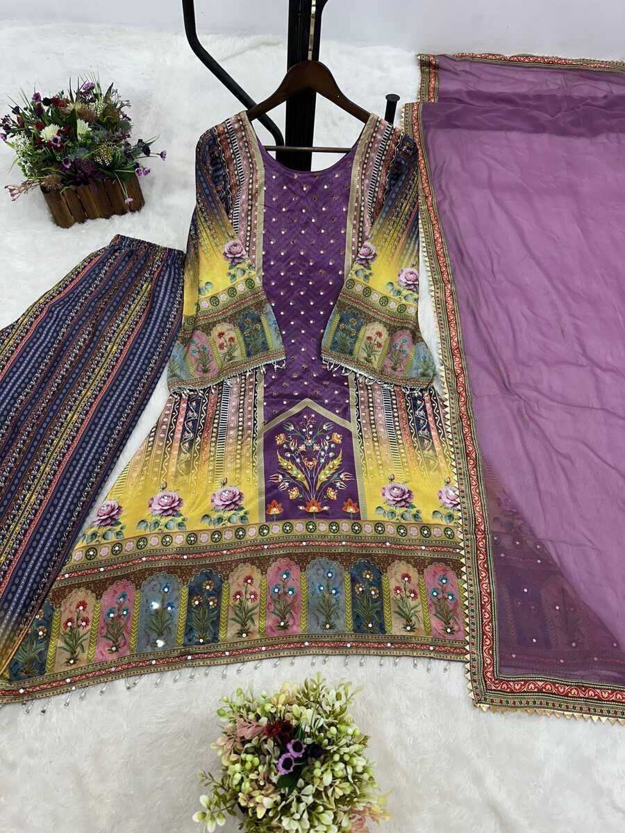WORK : BEAUTIFUL DIGITAL PRINT WITH REAL MIRROR HAND WORK AND HANGINGS LACE BORDER