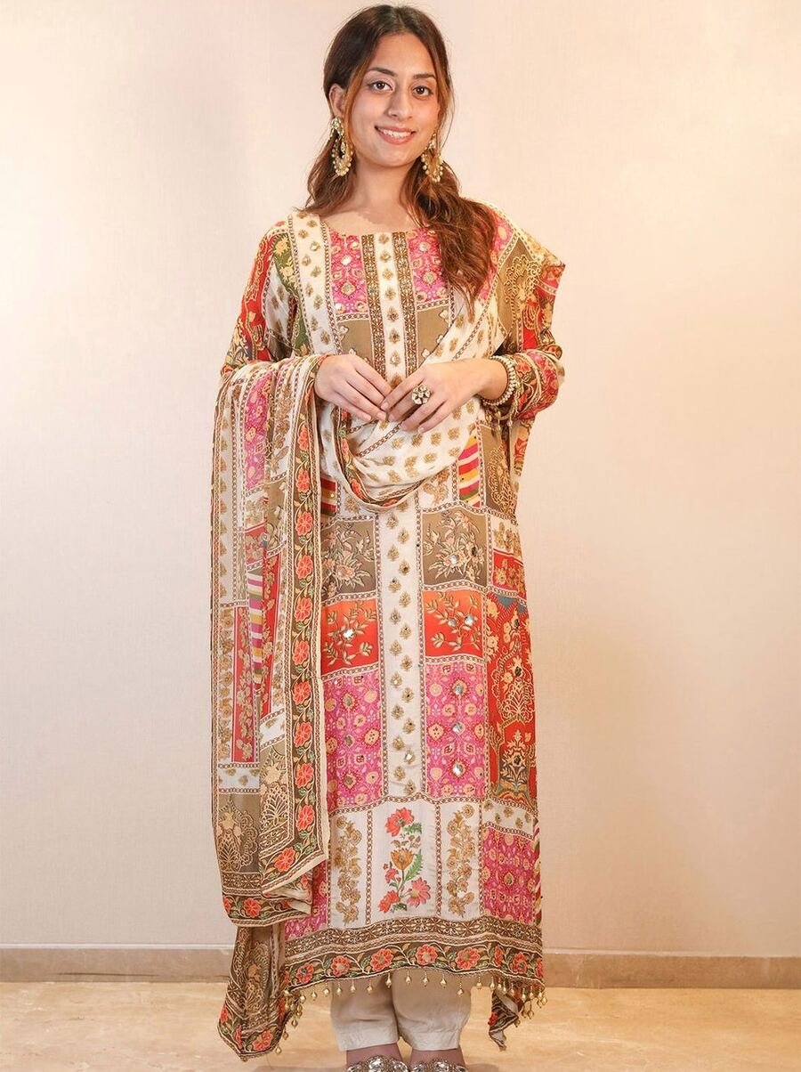 WORK :- BEAUTIFUL DIGITAL PRINT WITH READY MADE LACE(REAL MIRROR HAND WORK)