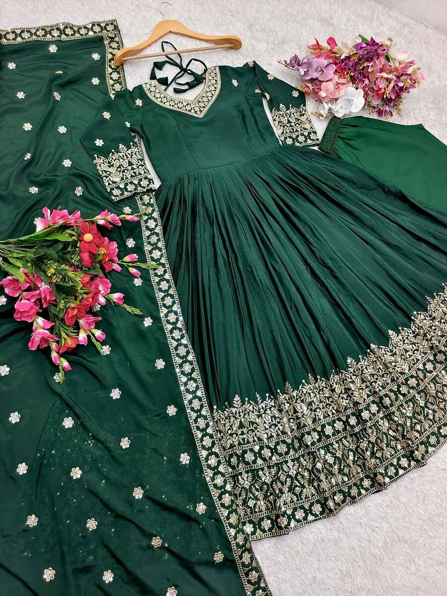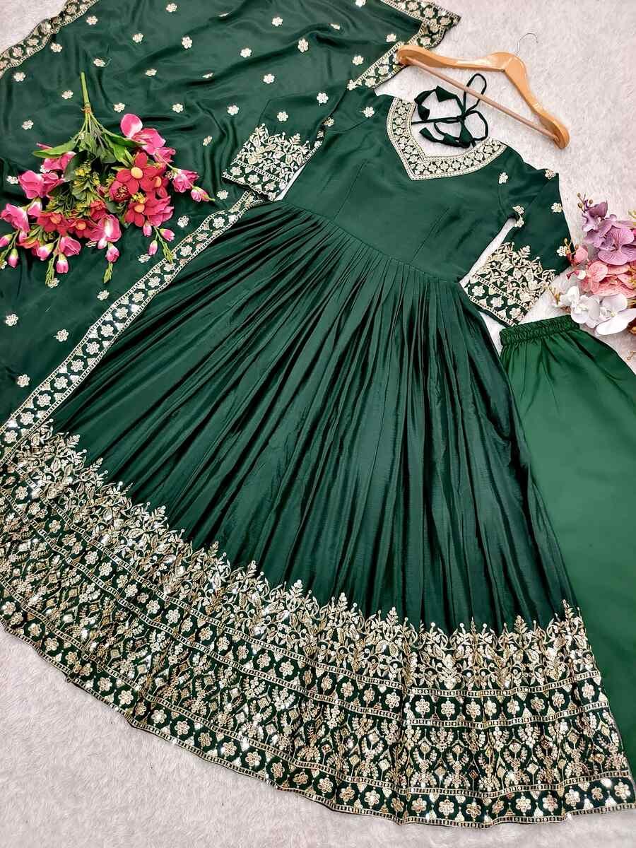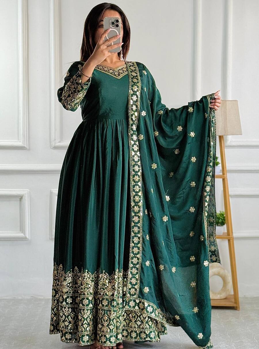 LATEST CHINON SILK EMBROIDERY SEQUENCE WORK GOWN BOTTOM WITH DUPATTA GREEN