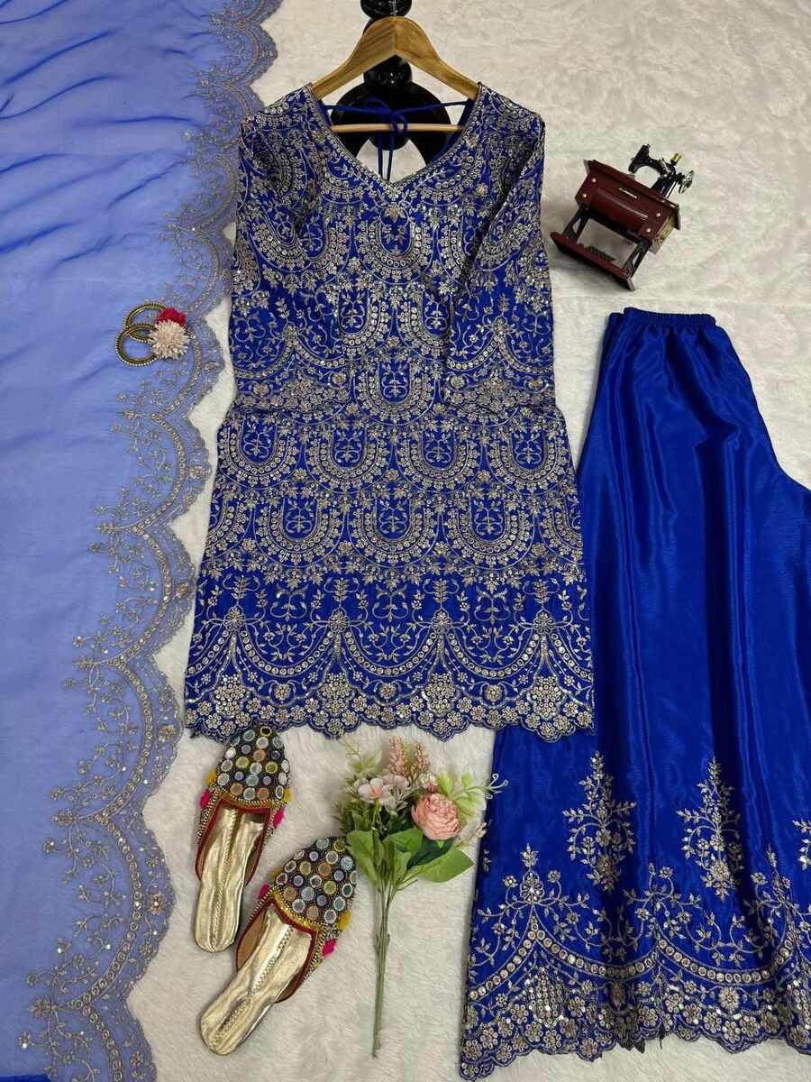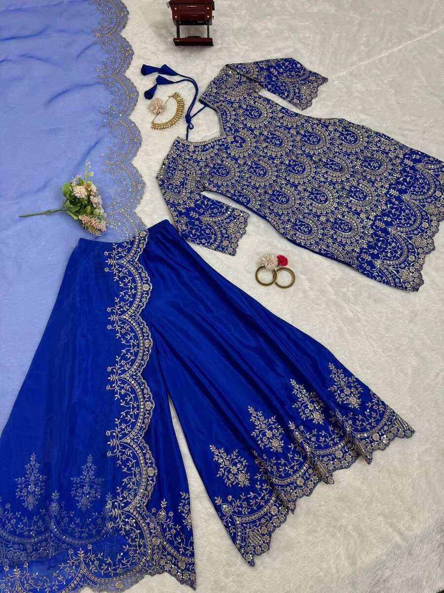 LATEST CHINON SILK THREAD WITH SEQUENCE WORK TOP PALAZZO WITH DUPATTA BLUIE