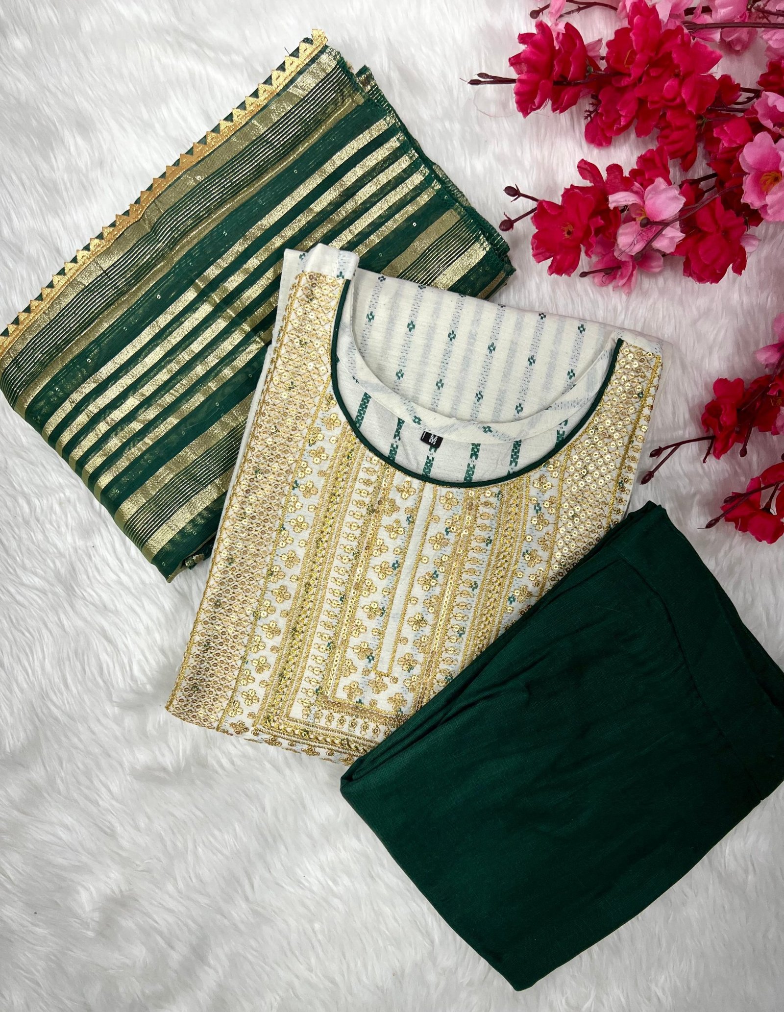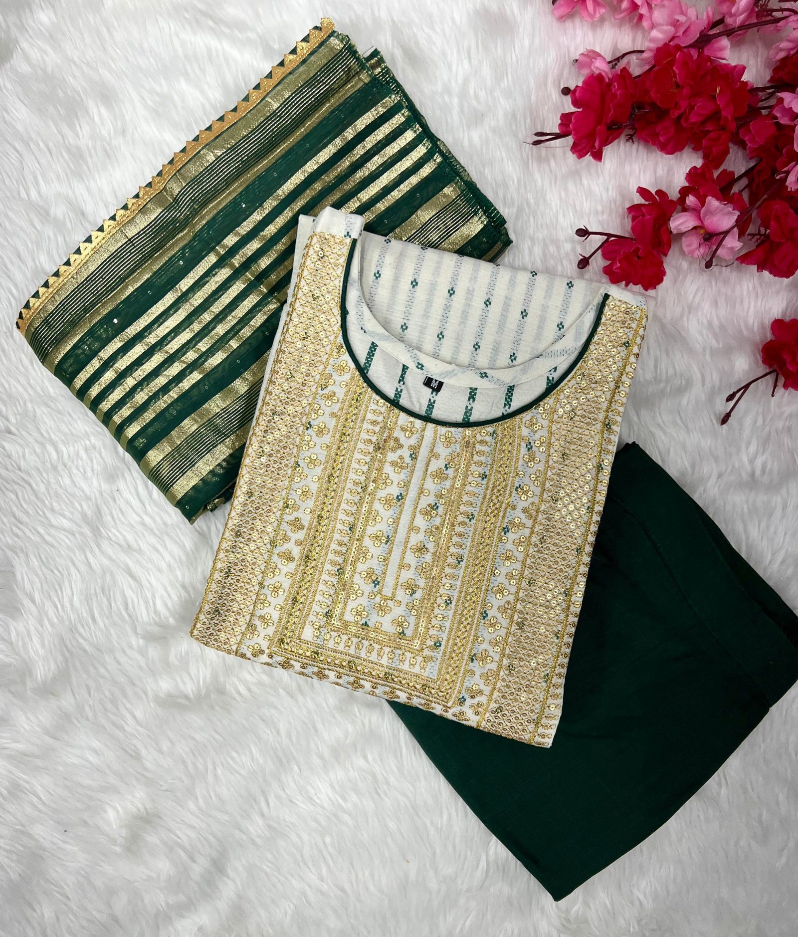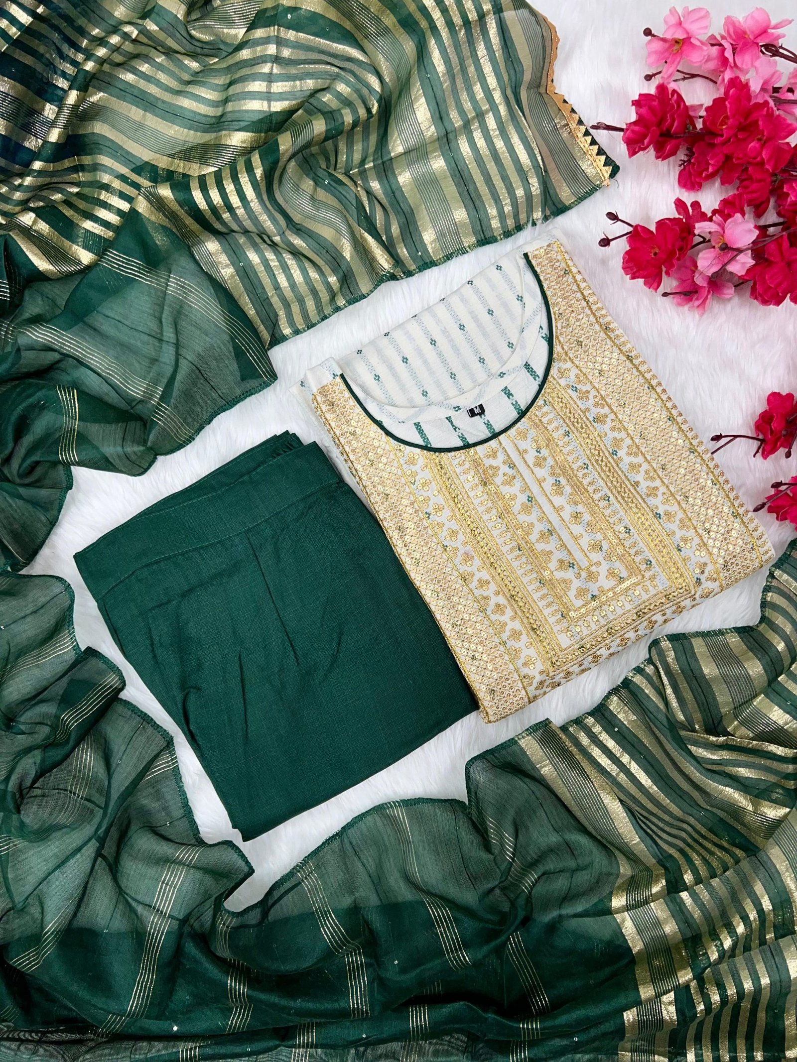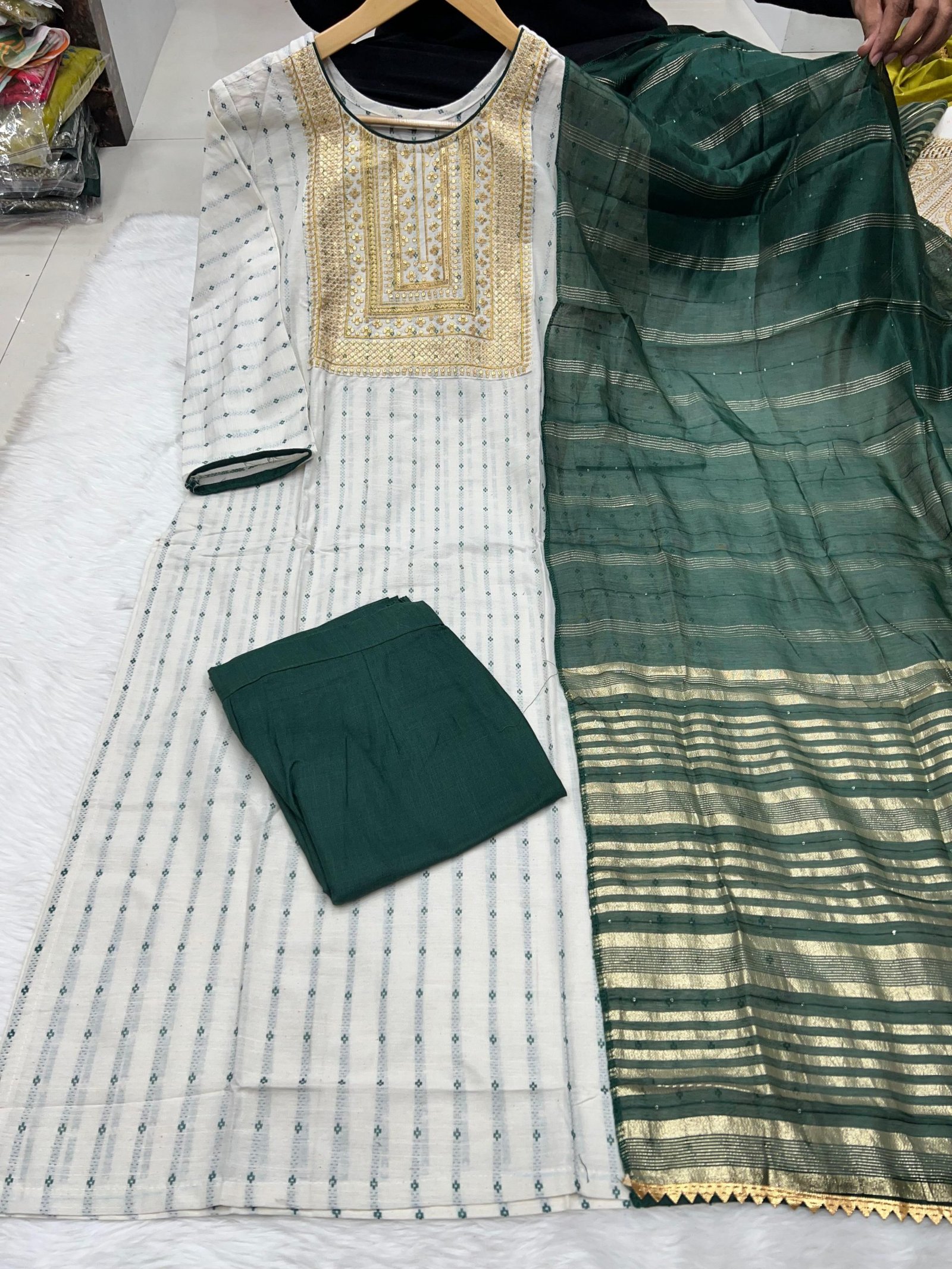 LATEST COTTON EMBROIDERY WEAVING WORK TOP BOTTOM WITH DUPATTA GREEN