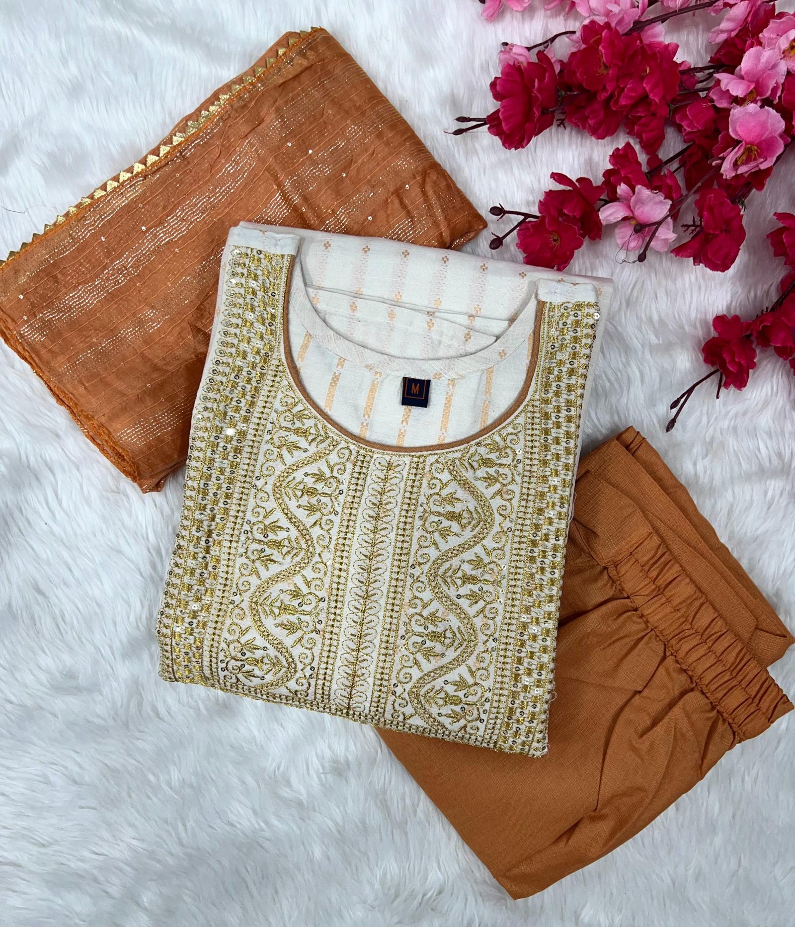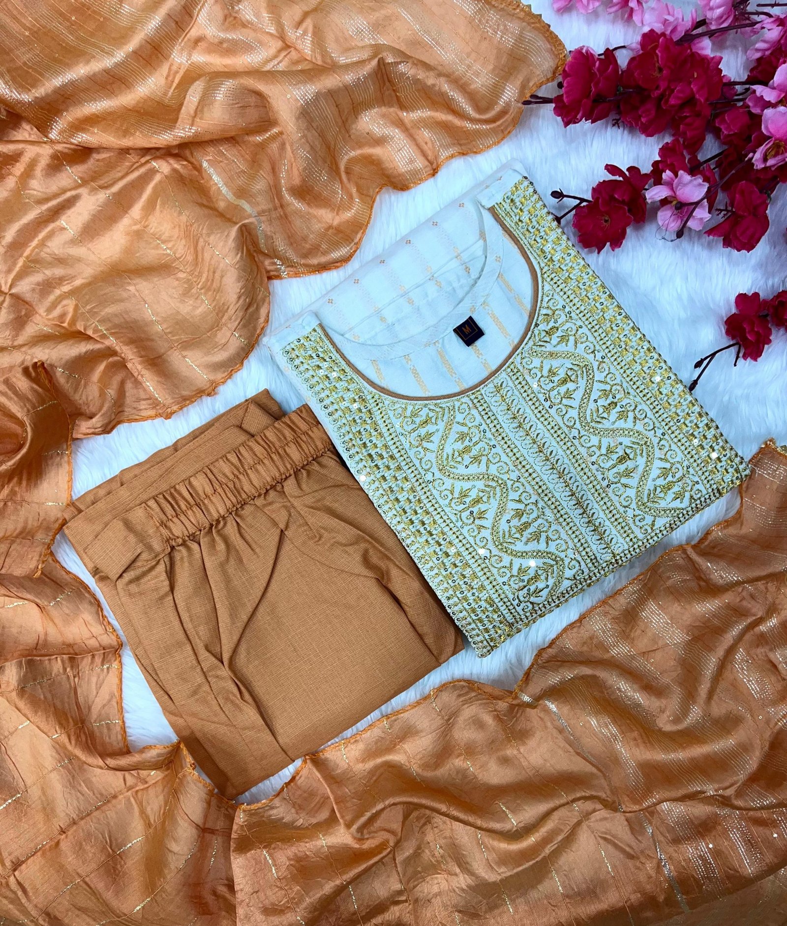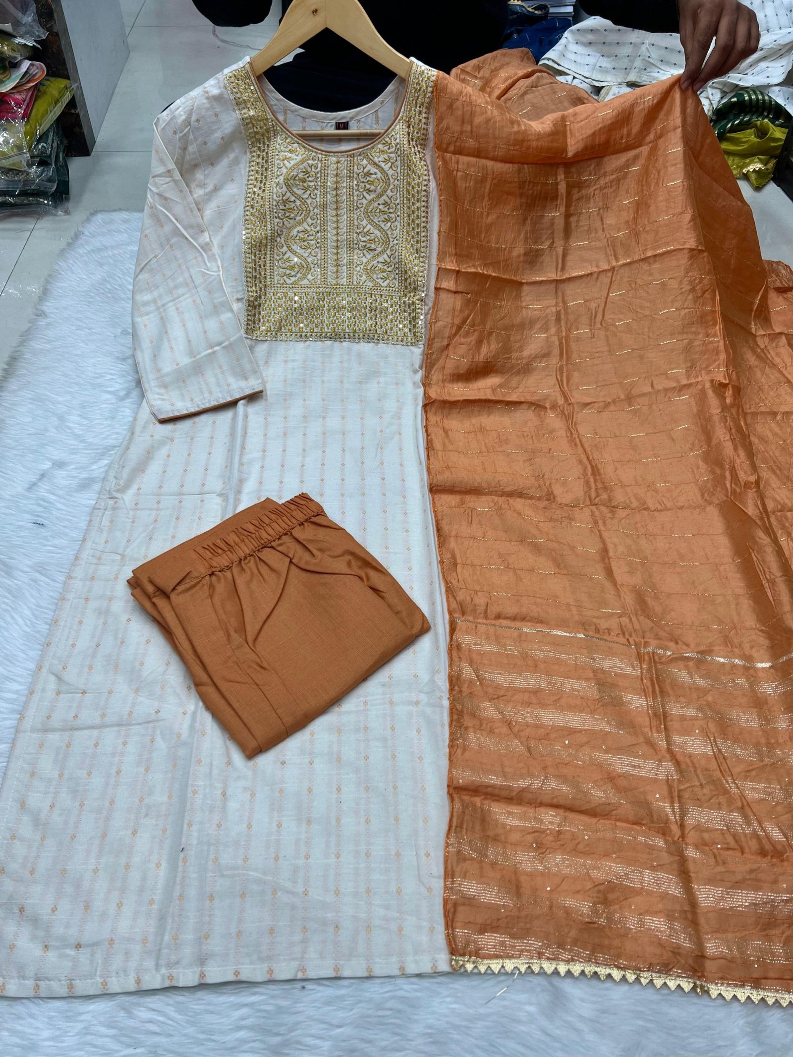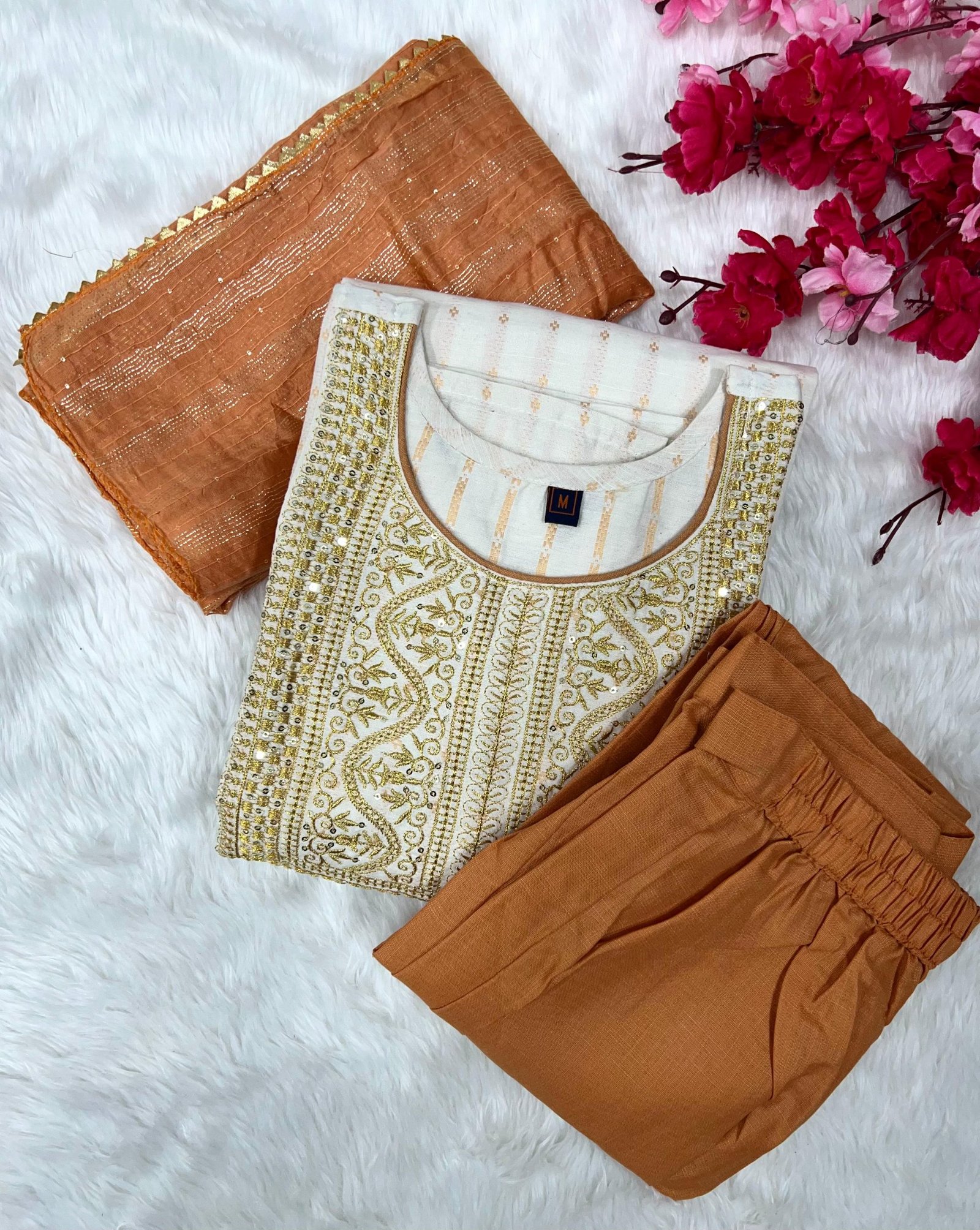 LATEST COTTON EMBROIDERY WEAVING WORK TOP BOTTOM WITH DUPATTA ORANGE