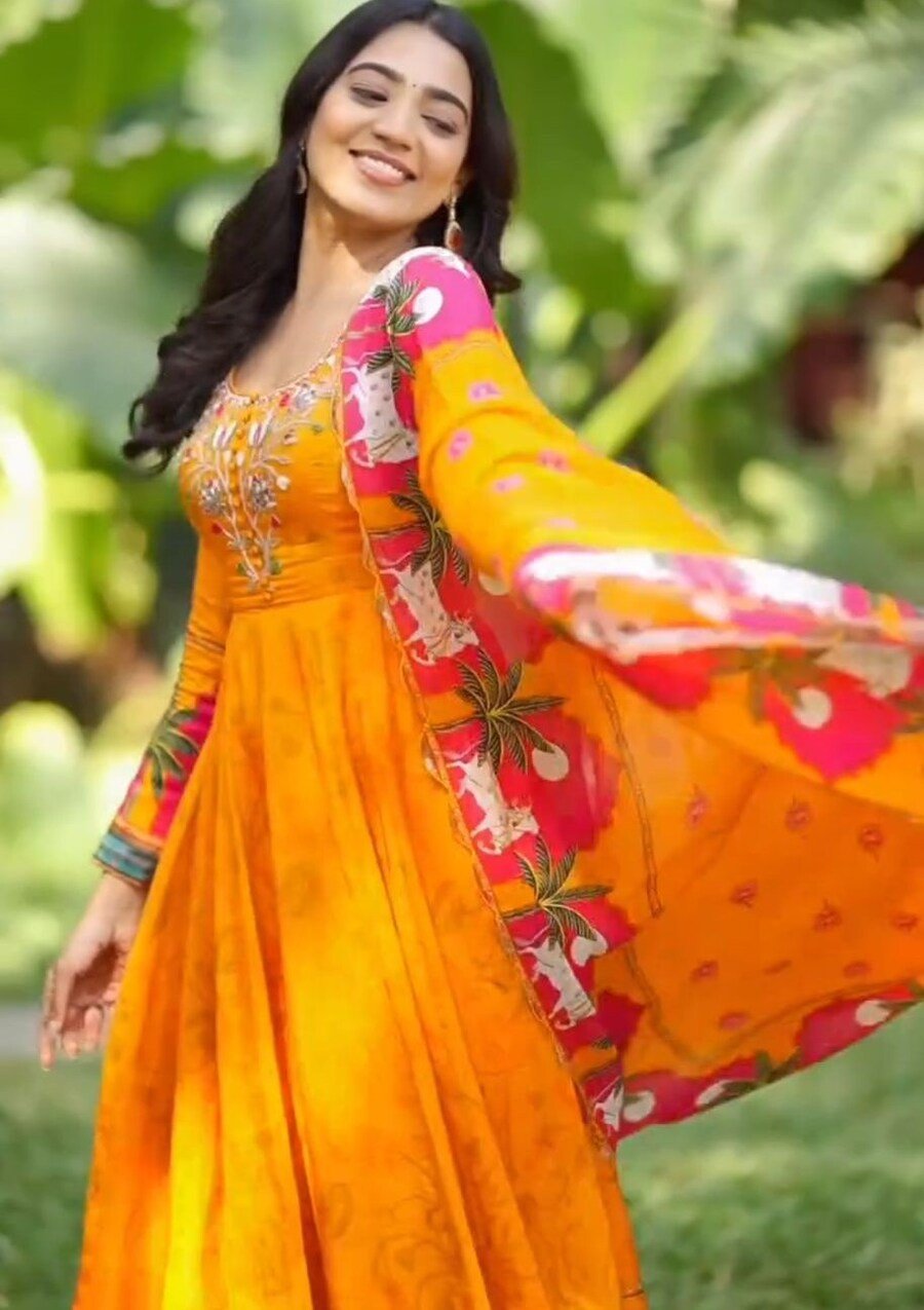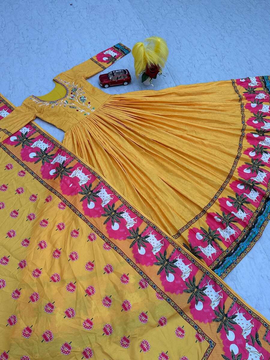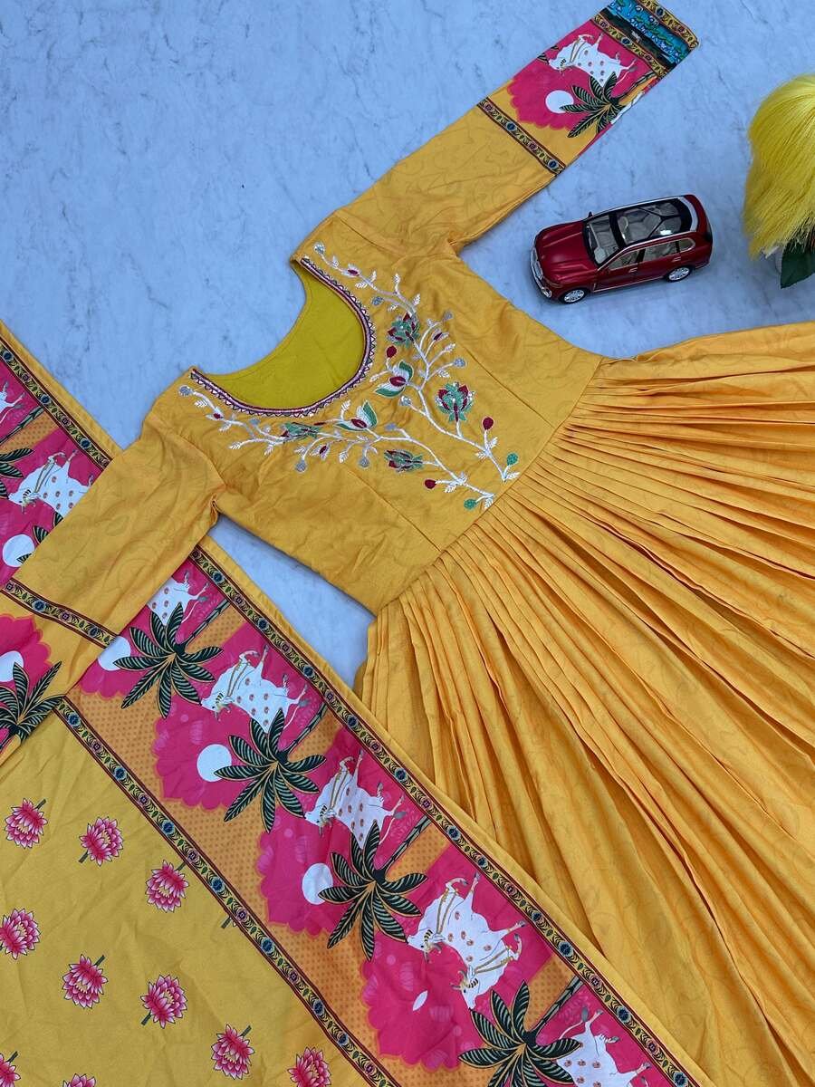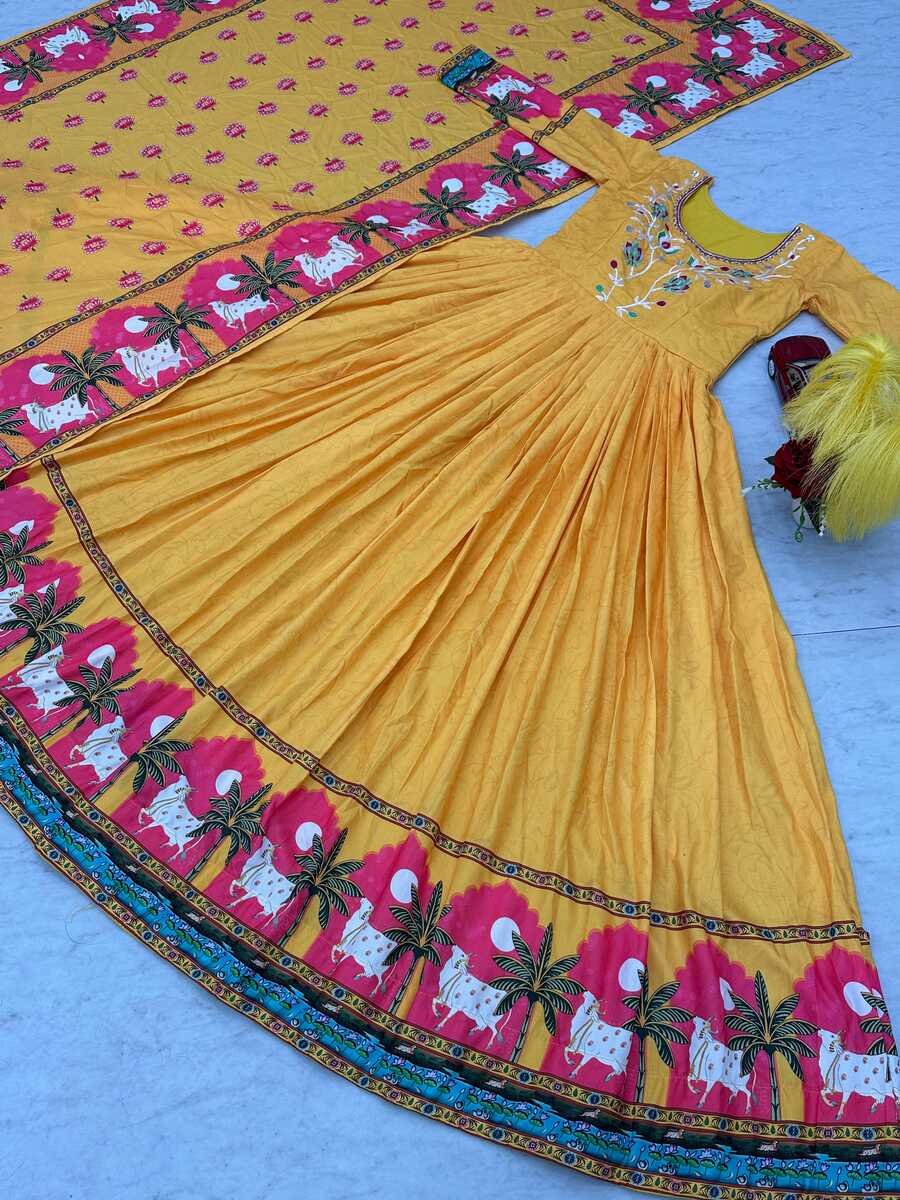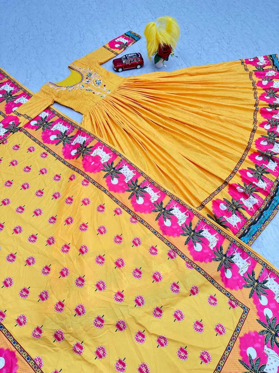 LATEST COTTON KALAMKARI PRINT WITH EMBROIDERY WORK GOWN WITH DUPATTA YELLOW