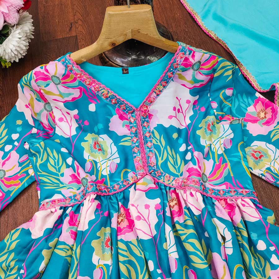 FABRIC DETAILS :- FABRIC: MUSLIN ALIA CUT DIGITAL SHINE PRINT AND EMBROIDERY , ZARI WEAVING WORK INCLUSIVE: TOP, BOTTOM & DUPATTA SIZE – M, L, XL, XXL