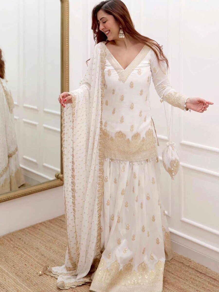 LATEST FAUX GEORGETTE SEQUENCE EMBROIDERY WORK TOP LEHNGA WITH DUPATTA WHITE