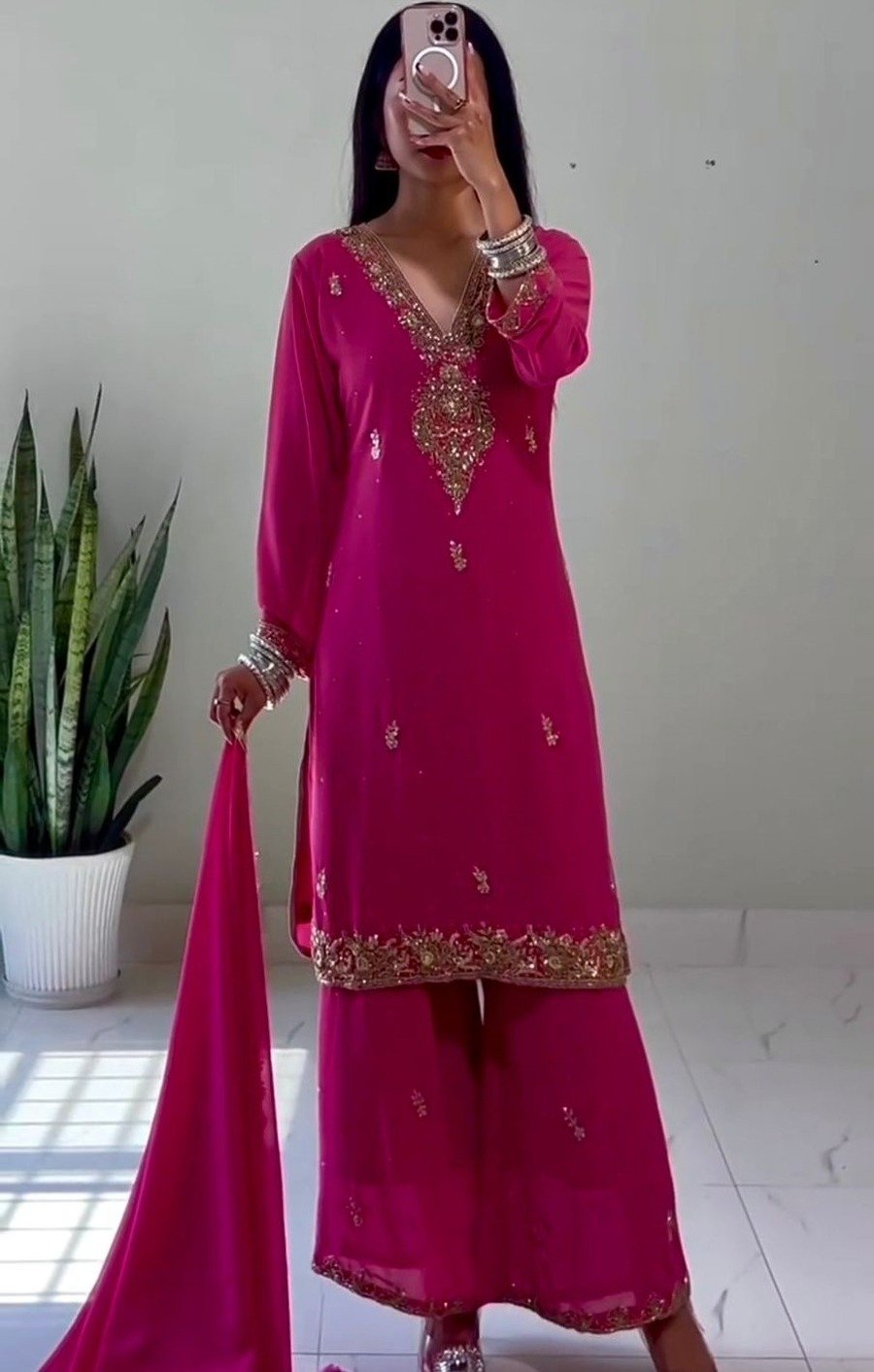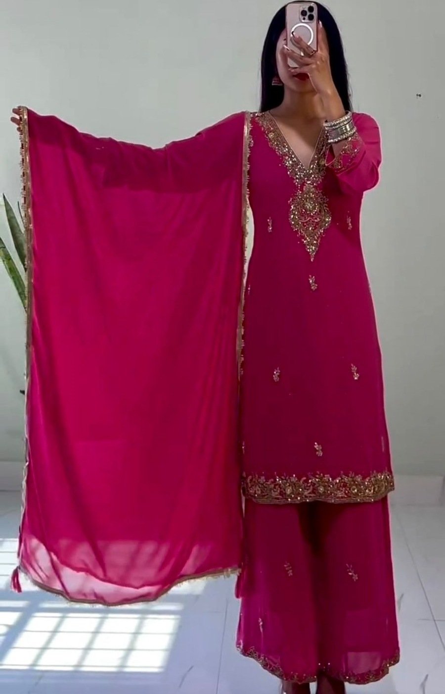 LATEST GEORGETTE EMBROIDERY AND CODING DORI SEQUENCE WORK TOP PALAZZO WITH DUPATTA PINK