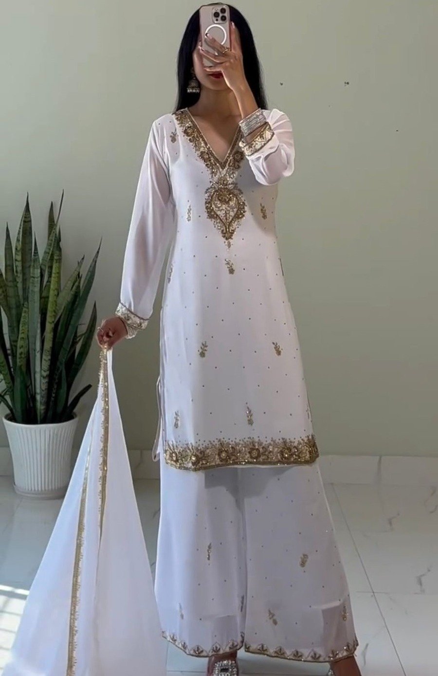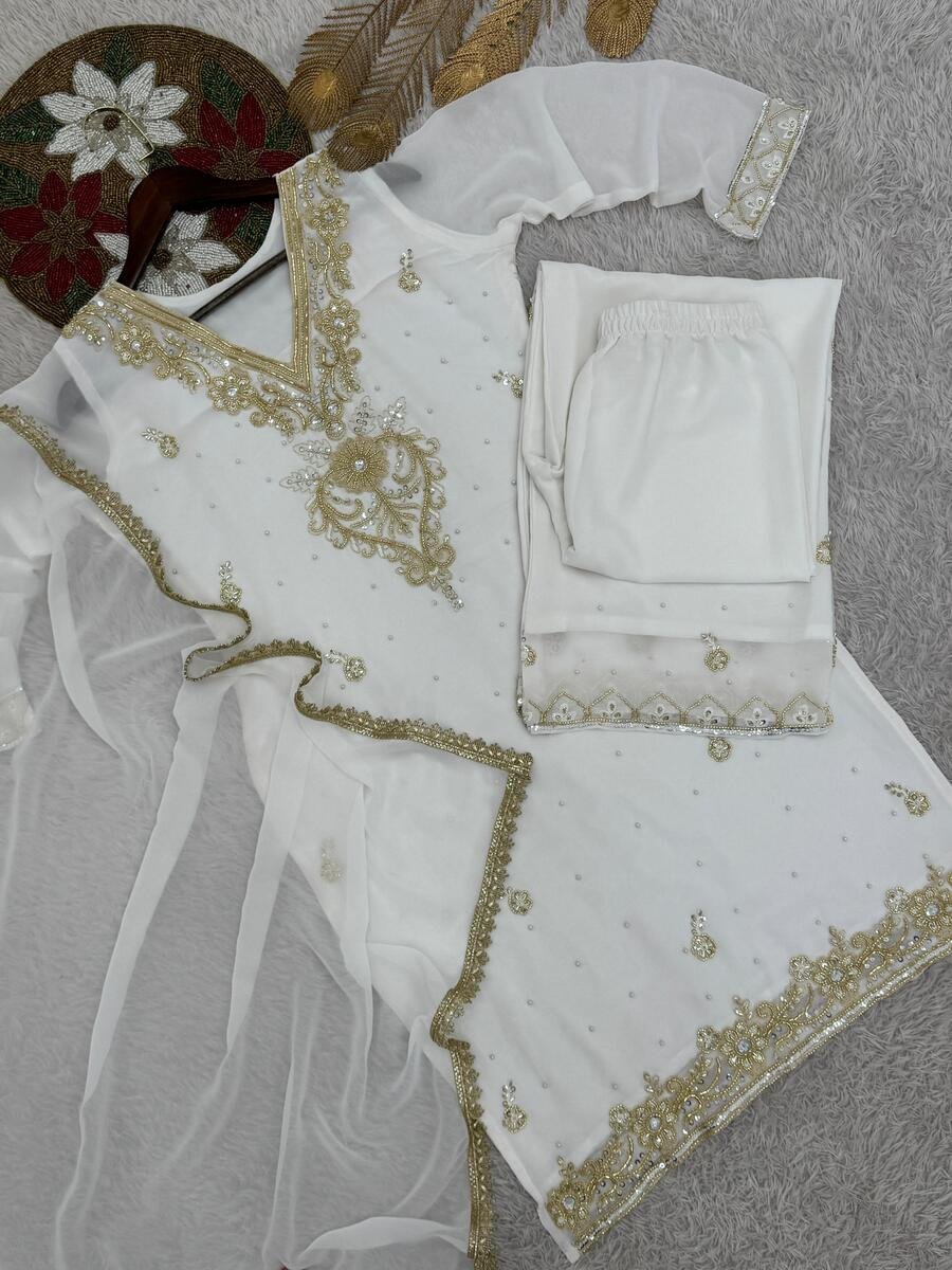 LATEST GEORGETTE EMBROIDERY AND CODING DORI SEQUENCE WORK TOP PALAZZO WITH DUPATTA WHITE