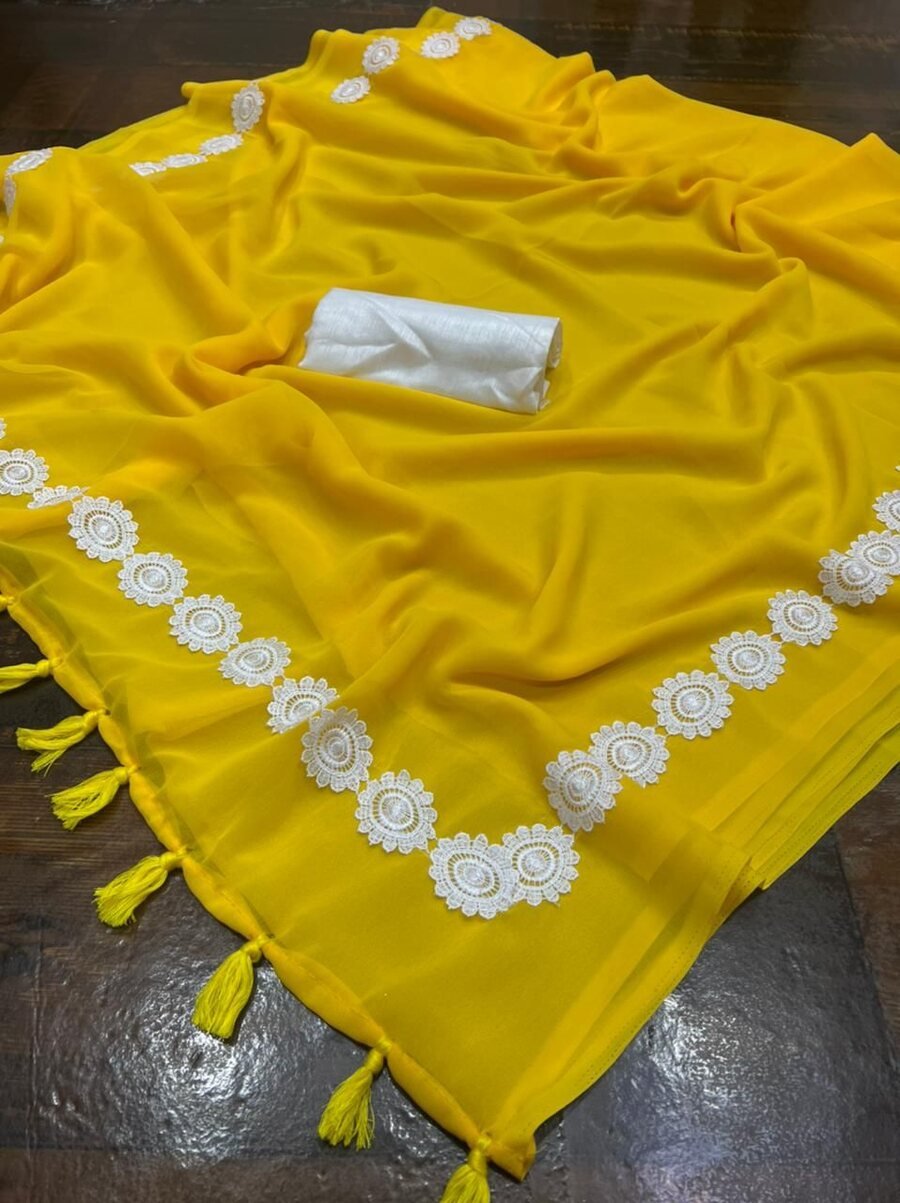 LATEST GEORGETTE LACE BORDER WORK SAREE WITH UNSTITCHED BLOUSE YELLOW