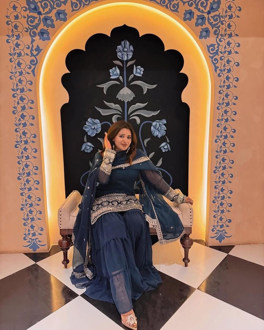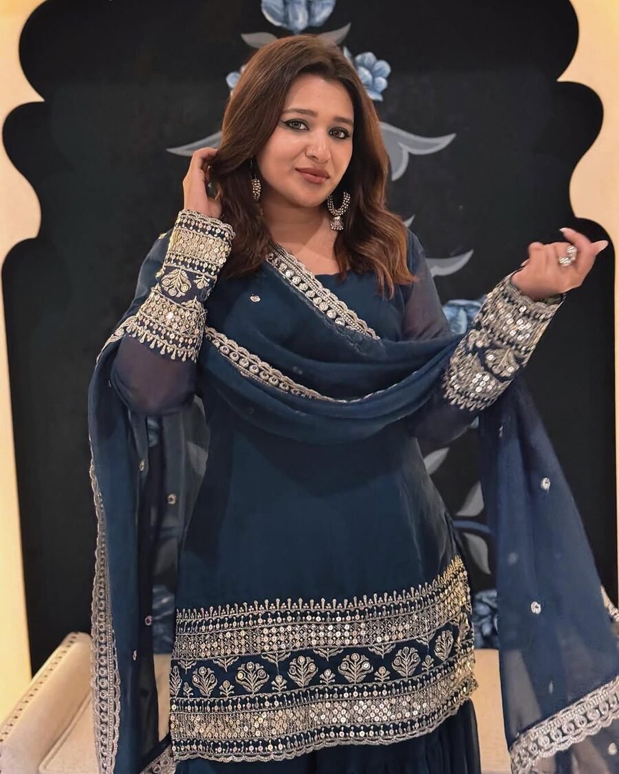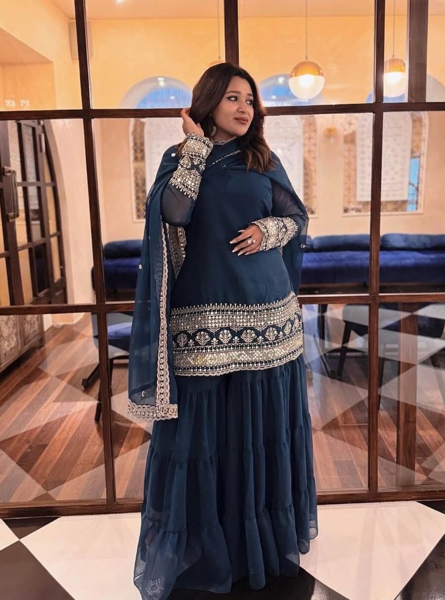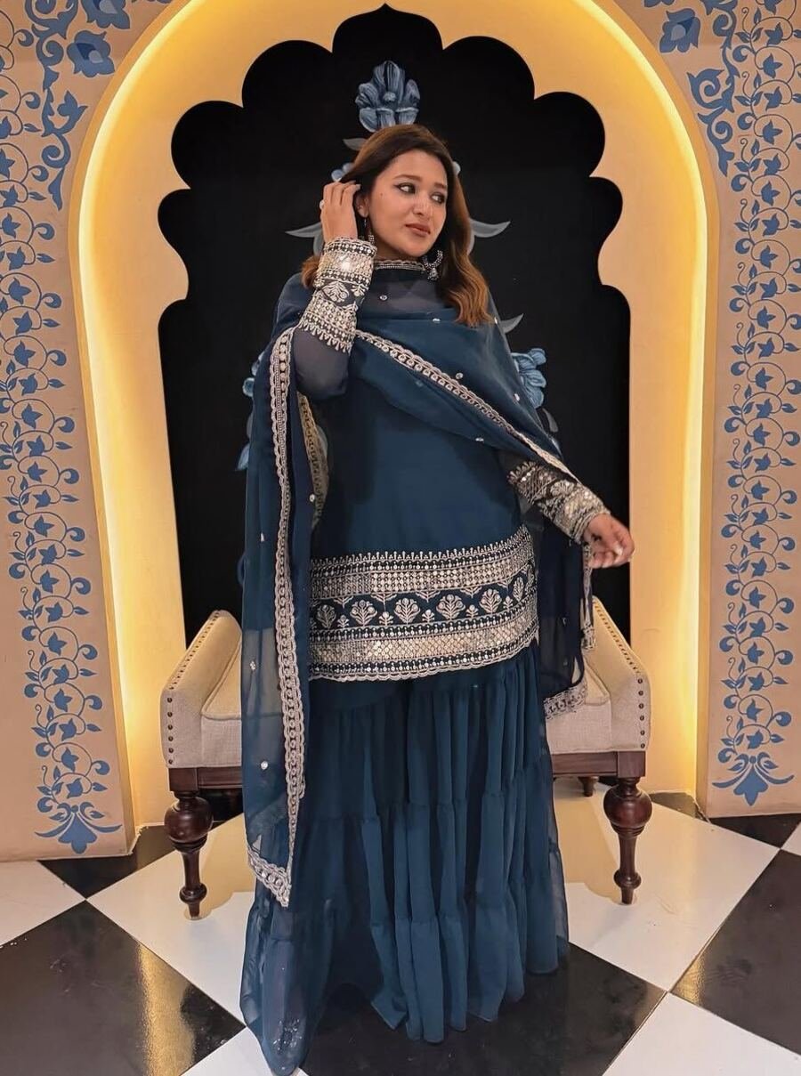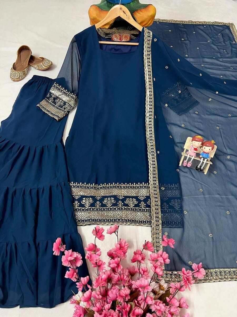 LATEST GEORGETTE SEQUENCE ZARI EMBROIDERY TOP RUFFLED SHARARA WITH DUPATTA BLUE
