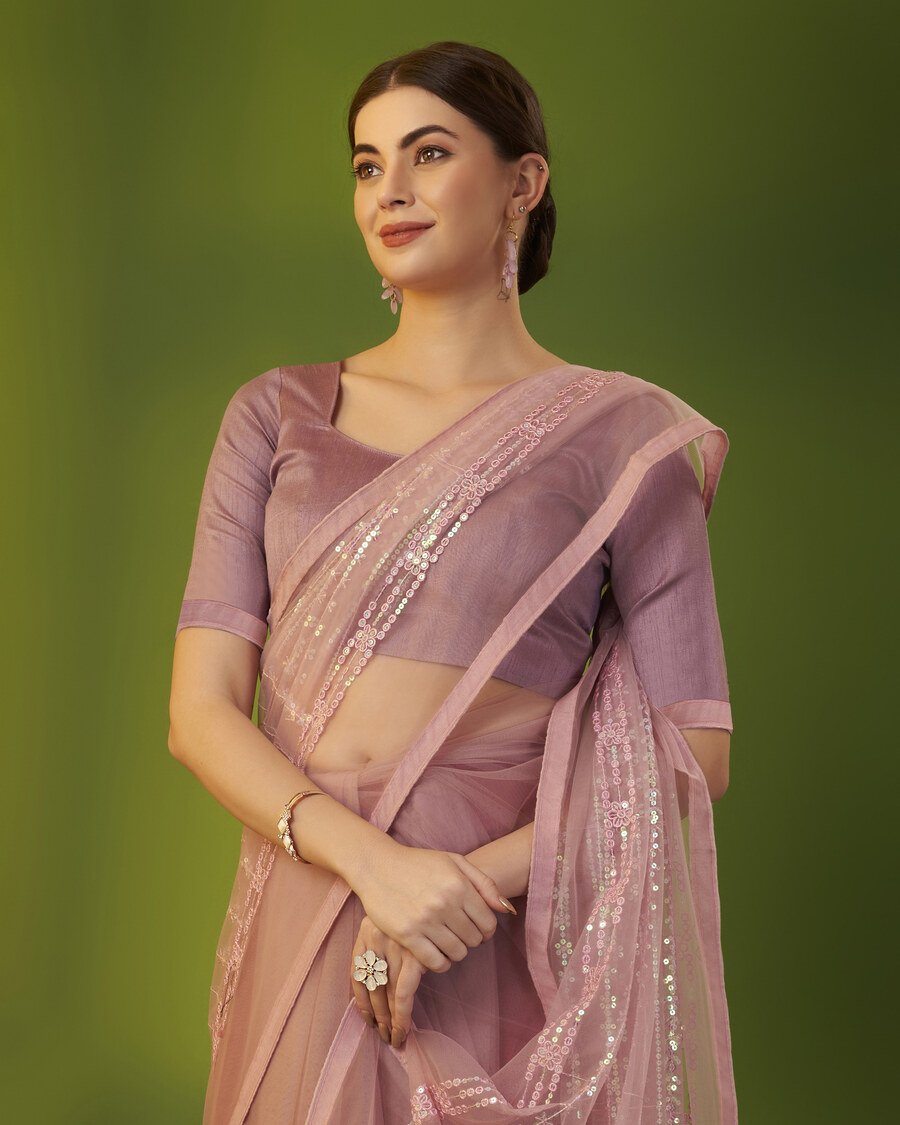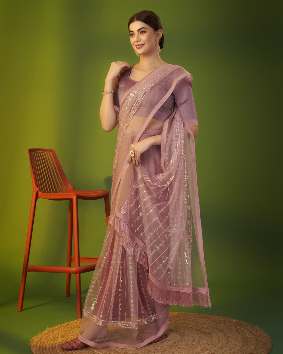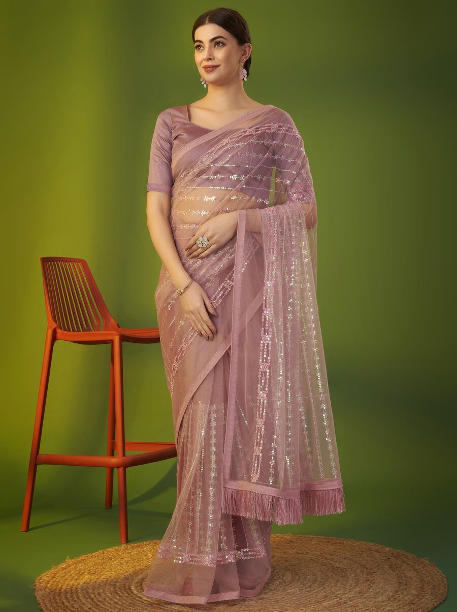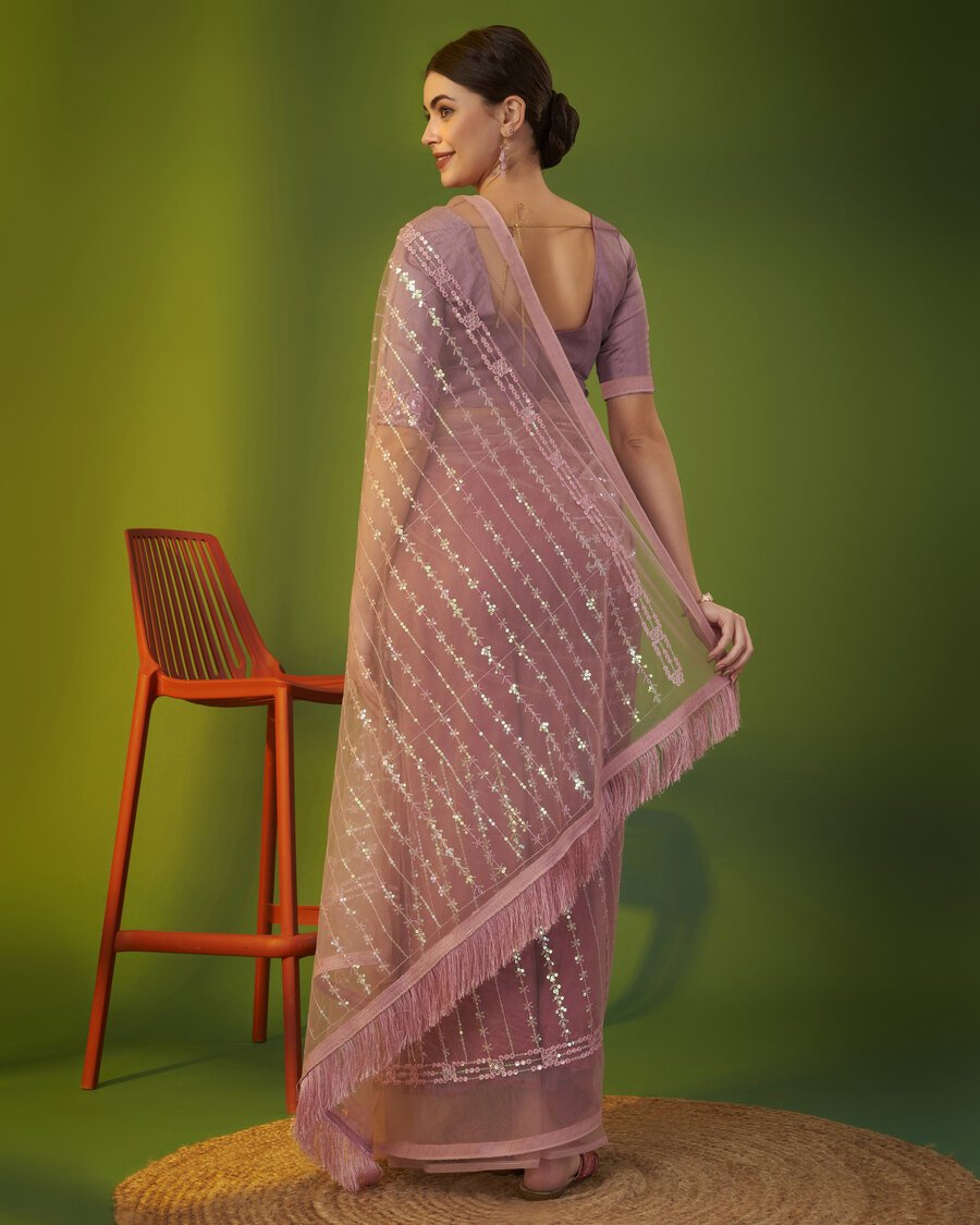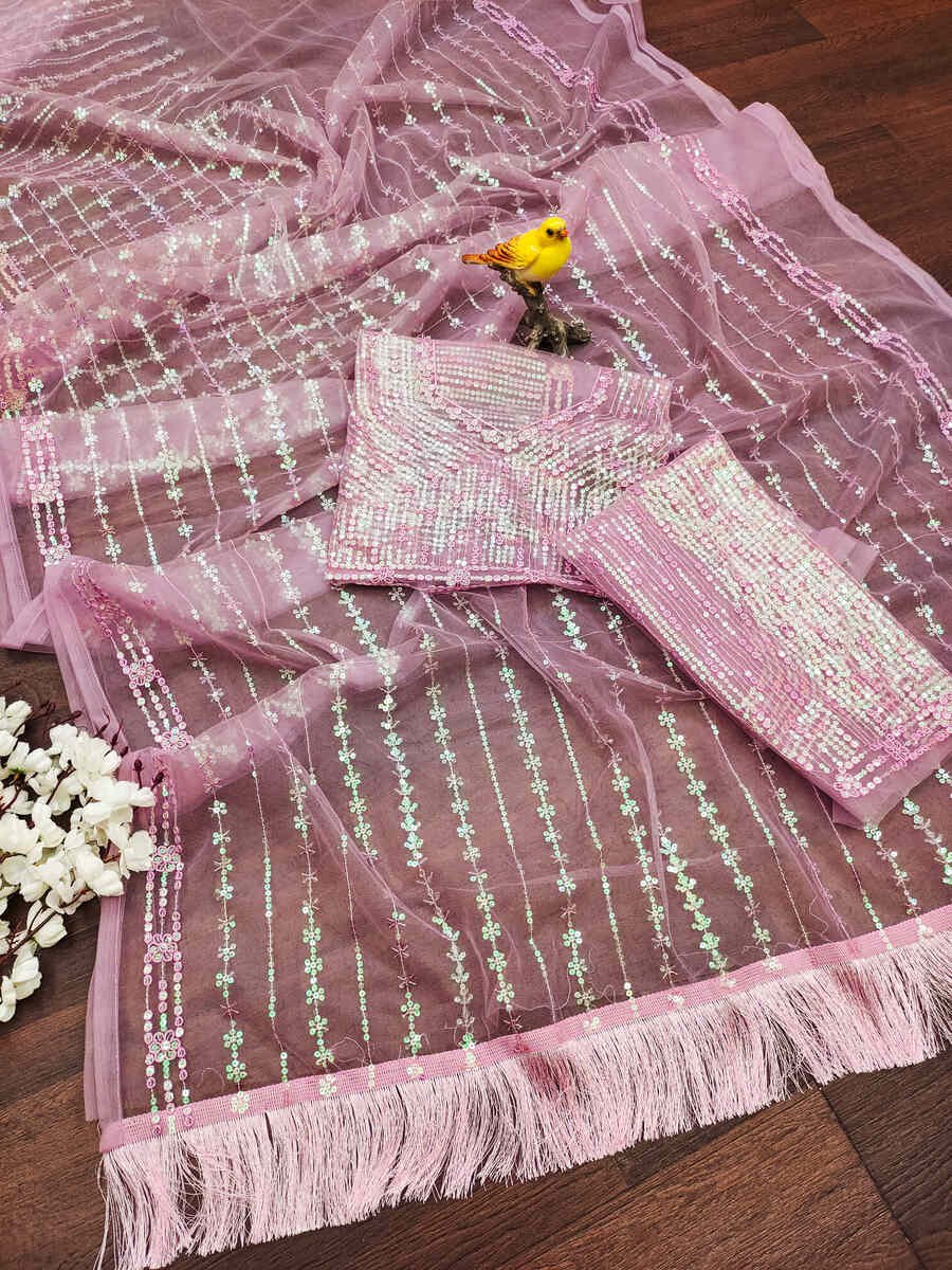 LATEST HEAVY BUTTERFLY NET THREAD SEQUENCE EMBROIDERY WORK SAREE WITH UNSTITCHED BABY PINK