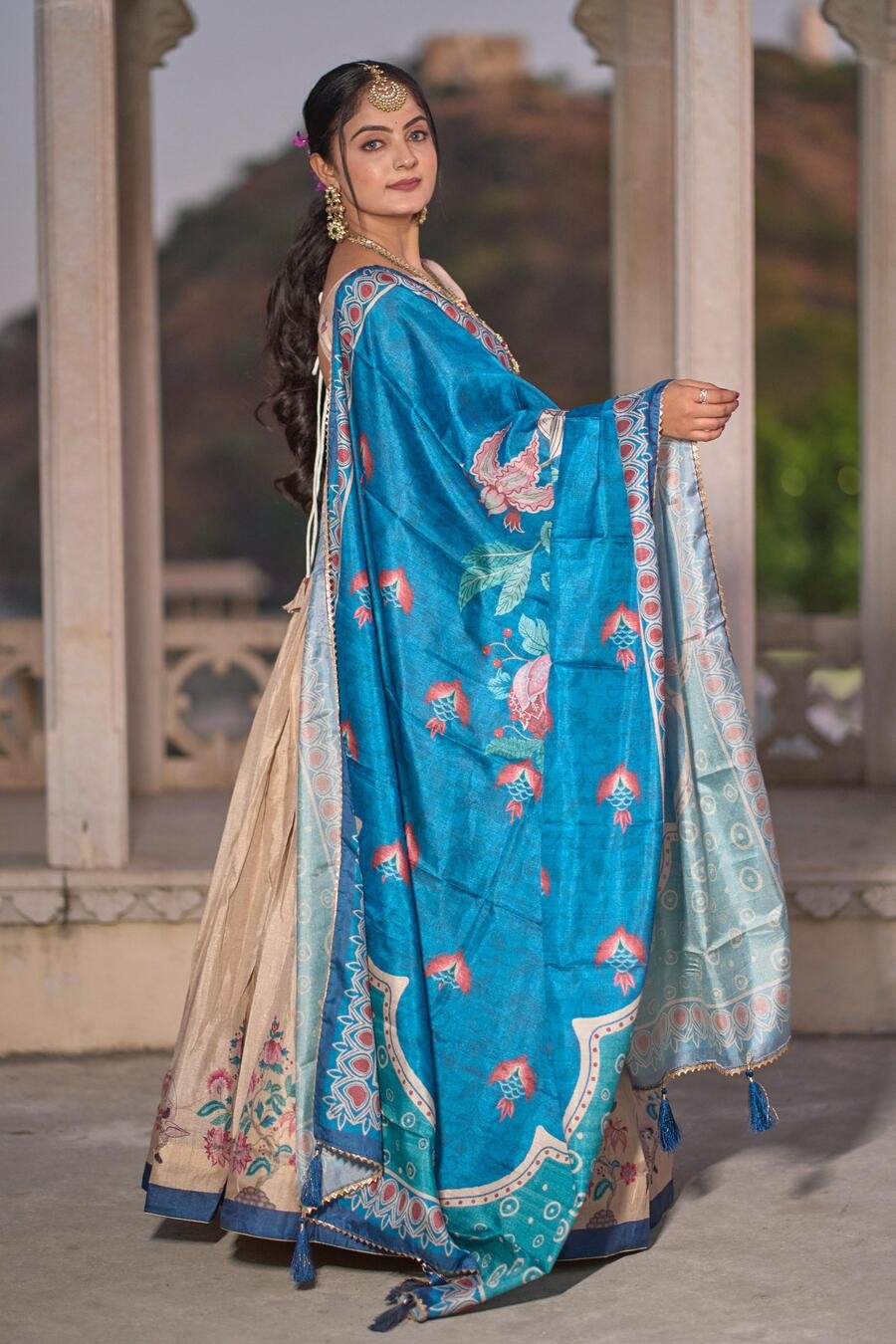 LATEST MANIPURI SILK PRINTED WITH CONTRAST BORDER WORK LEHENGA CHOLI WITH DUPATTA CREAM