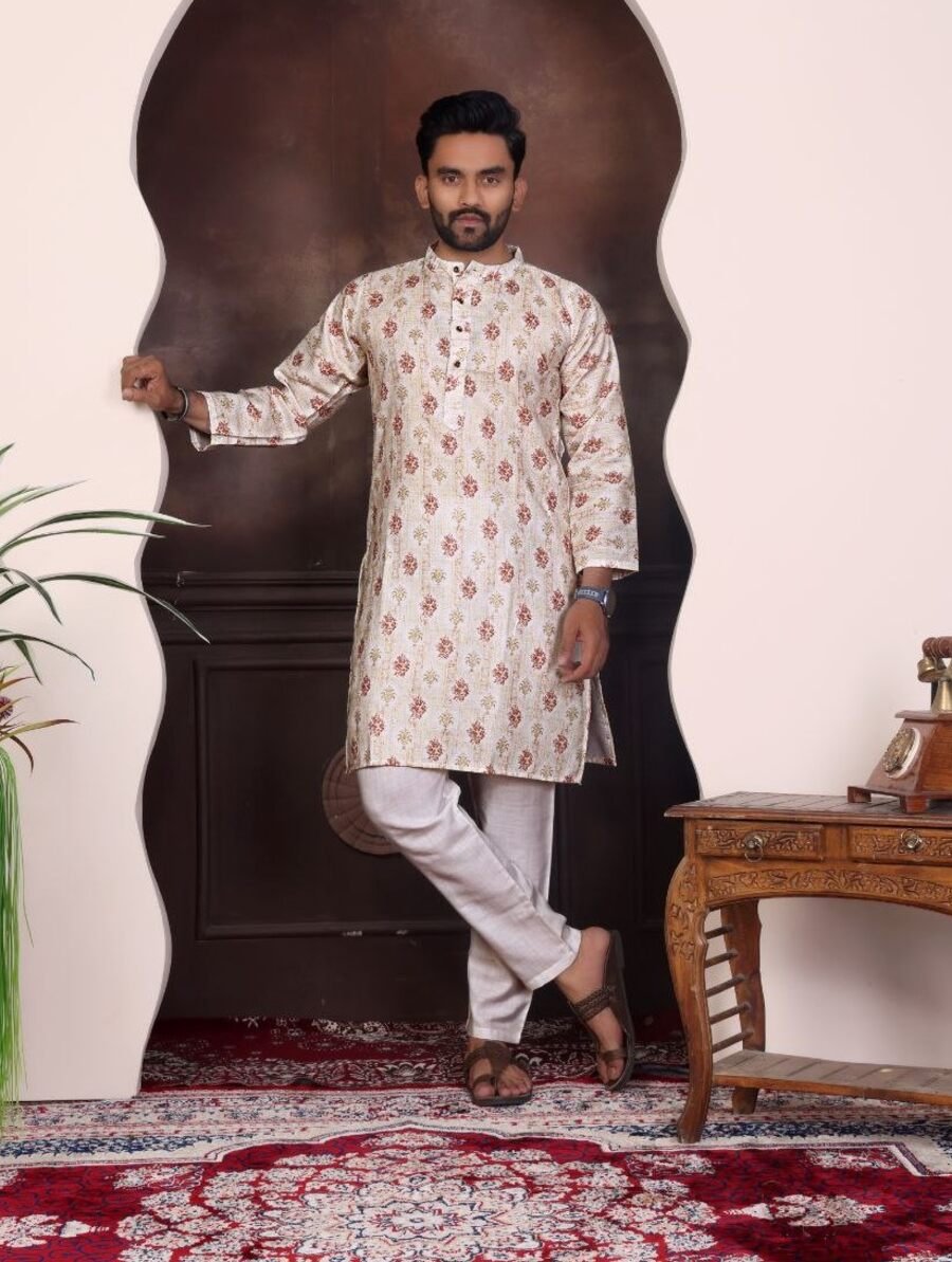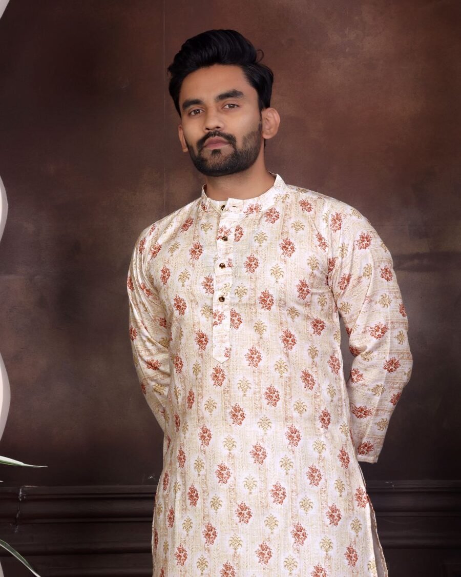LATEST PURE COTTON DIGITAL PRINTED MEN’S KURTA WITH PAYJAMA CREAM