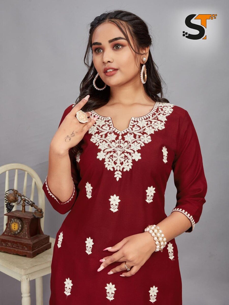 LATEST RAYON EMBROIDERY WORK SHORT KURTI MAROON