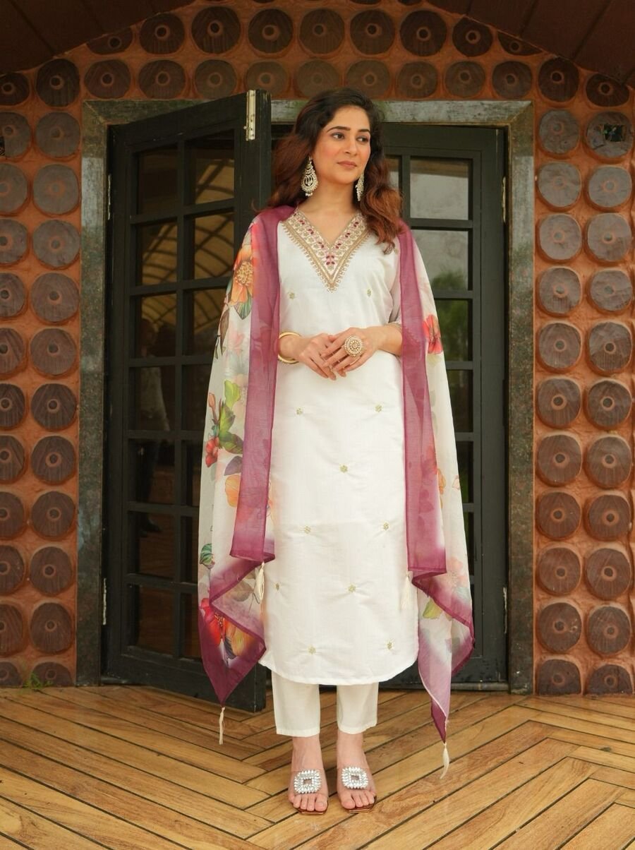 LATEST ROMAN SILK EMBROIDERY SEQUENCE WORK TOP BOTTOM WITH DUPATTA OFF WHITE