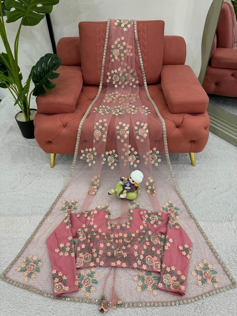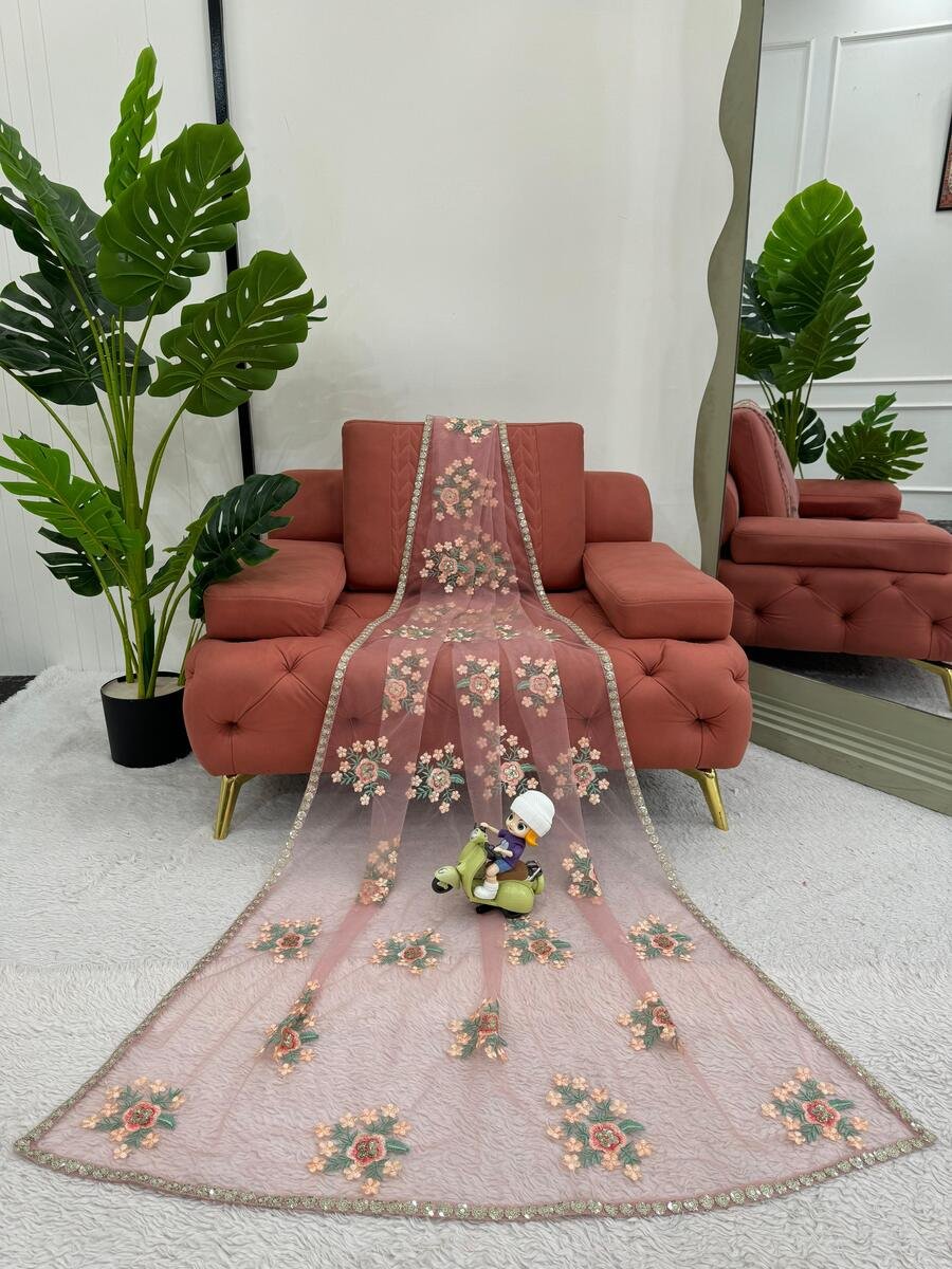 LATEST SOFT NET THREAD WITH SEQUENCE WORK SAREE WITH UNSTITCHED BLOUSE BABY PINK