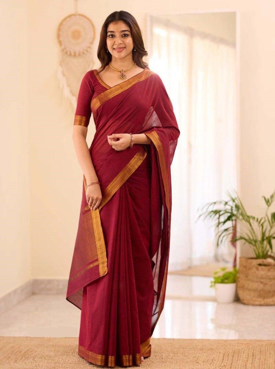 LATEST SOUTH COTTON PLAIN BODY WITH CONTRAST WAVING BORDER WORK SAREE WITH UNSTITCHED BLOUSE MAROON