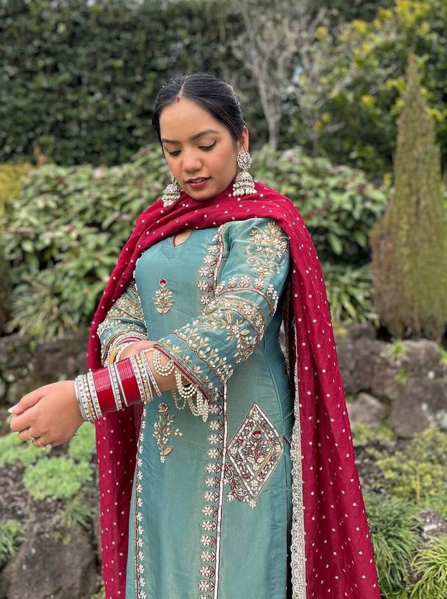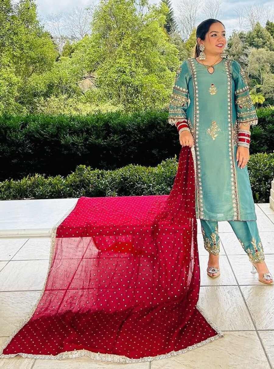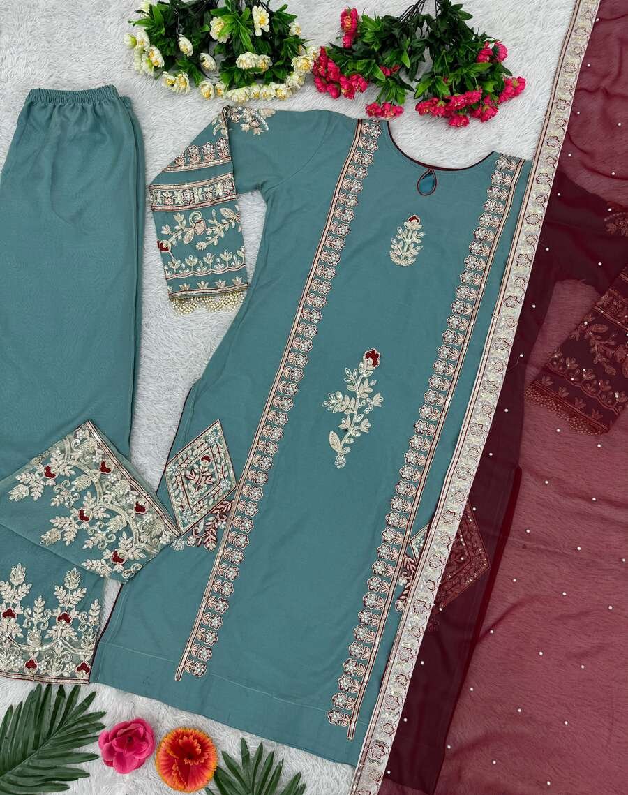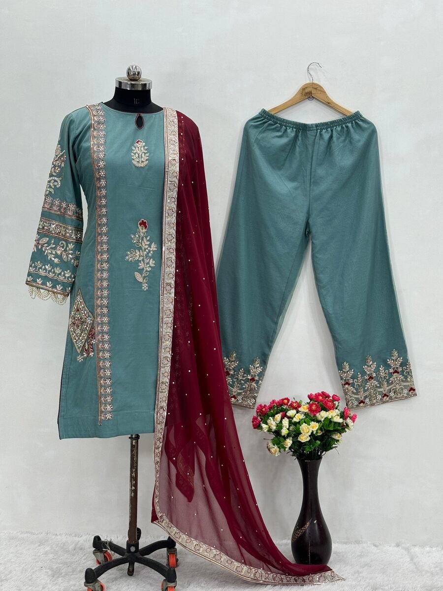 LATEST TABBY ORGANZA CHAIN STITCH WORK AND FANCY HAND WORK TOP PALAZZO WITH DUPATTA SKY