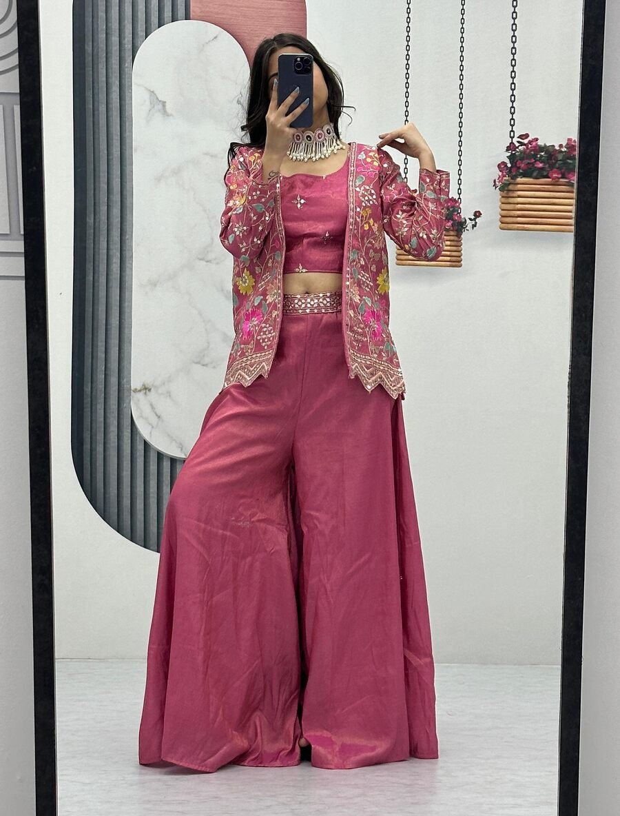 LATEST TISSUE SIMMER EMBROIDERY SEQUENCE WORK CROP TOP PALAZZO WITH SHRUG PINK