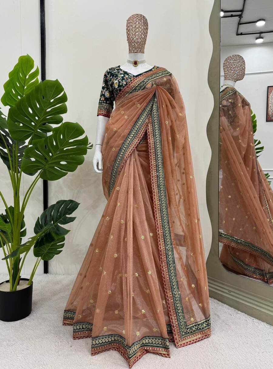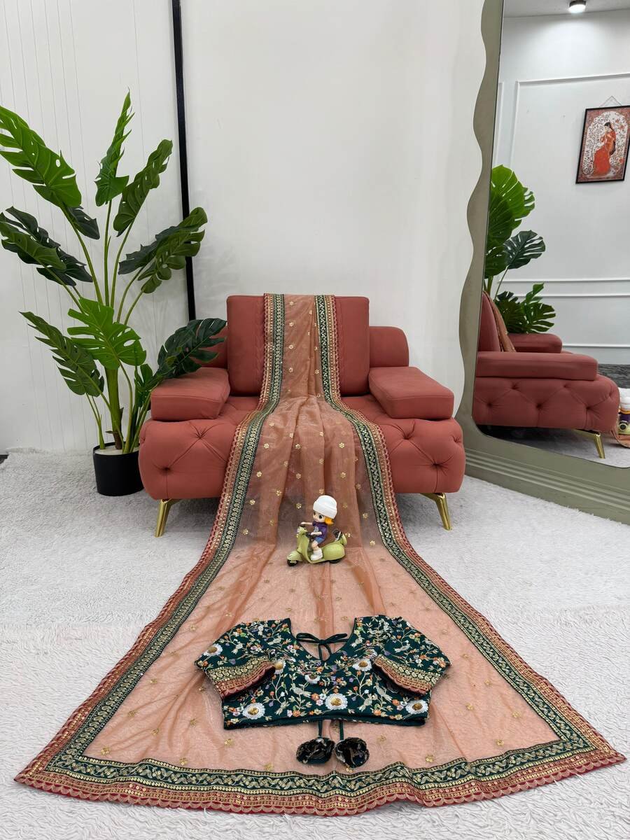 LATEST TWILL NET THREAD SEQUENCE WORK SAREE WITH UNSTITCHED BLOUSE PEACH