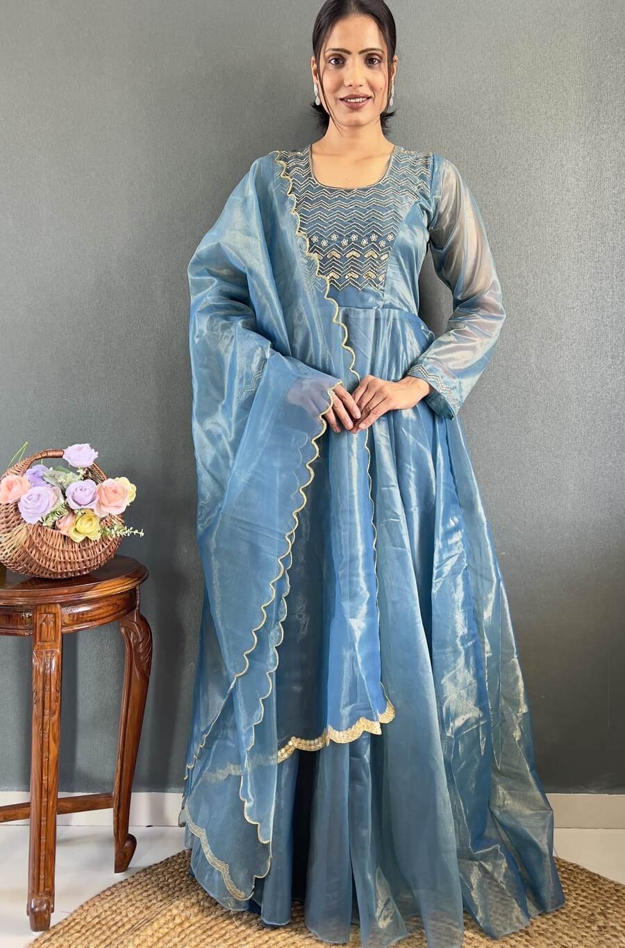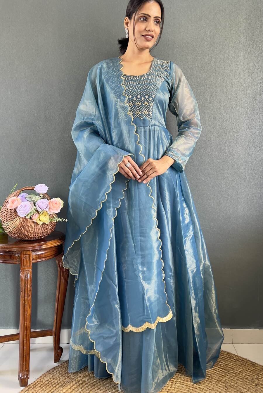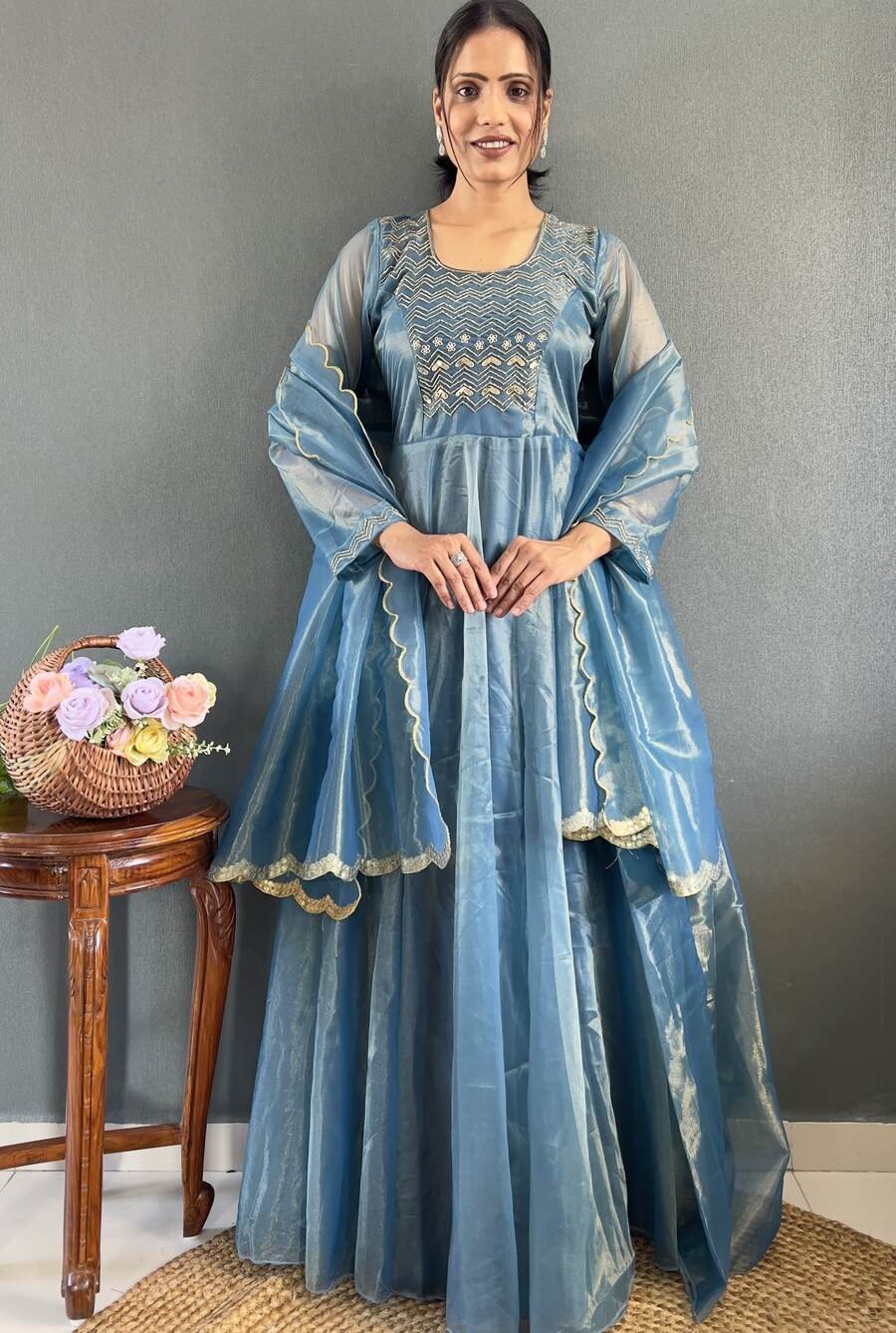 LATEST TWILL NET TISSUE SILK CUTDANA HAND WORK GOWN WITH DUPATTA SKY