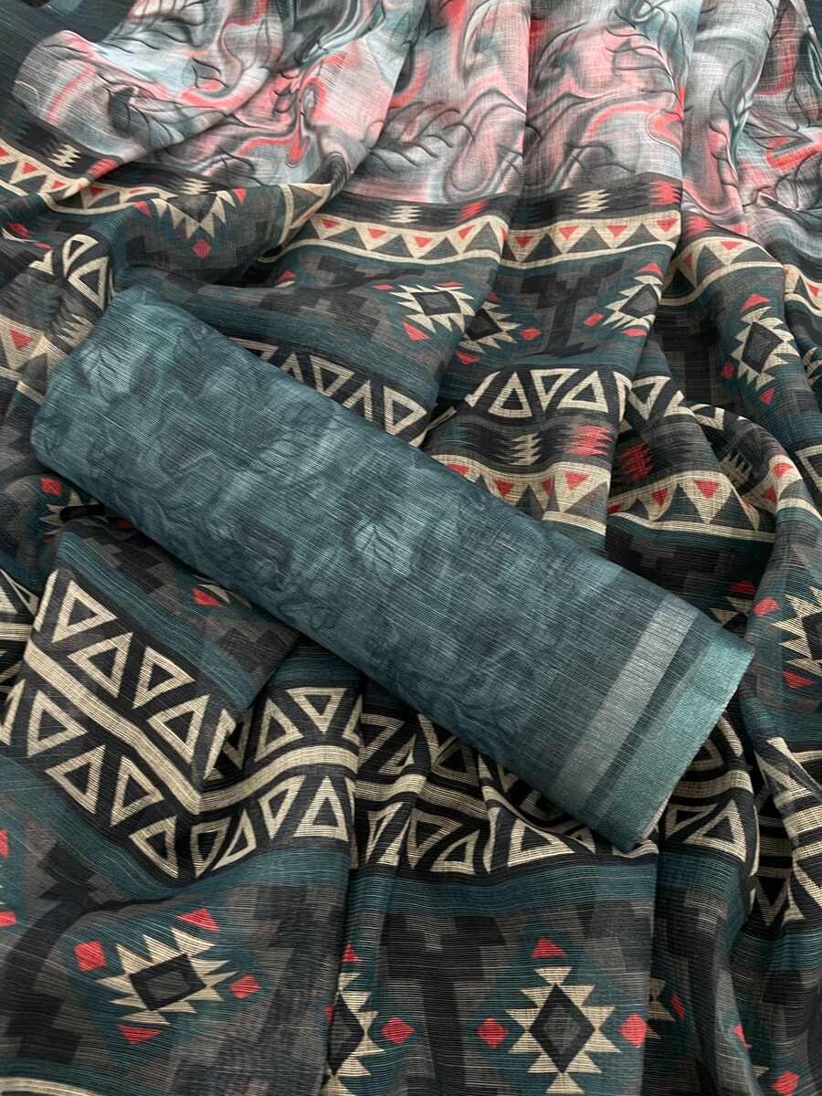 LUXURY HANDLOOM LINEN COTTON DIGITAL PRINTED SAREE WITH UNSTITCHED BLOUSE TEAL