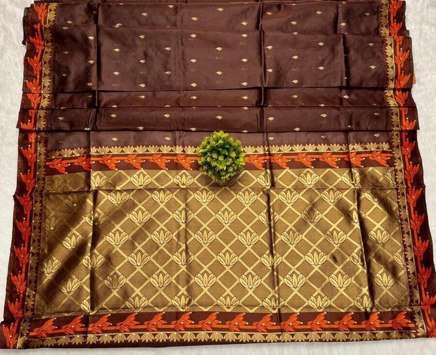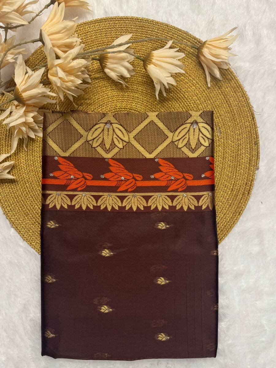 MODERN BANARASI SOFT SILK GOLD & SILVER ZARI WEAVING WORK SAREE WITH UNSTITCHED BLOUSE BROWN