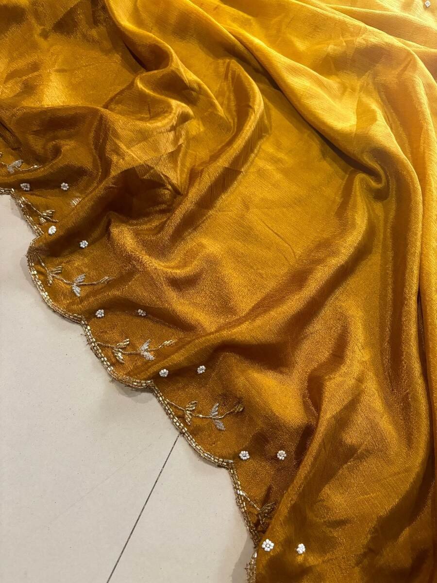 MODERN CHINON PADDING RICH CUT DANA AND MOTI FLOWERS HANDWORK BORDER SAREE WITH UNSTITCHED BLOUSE YELLOW