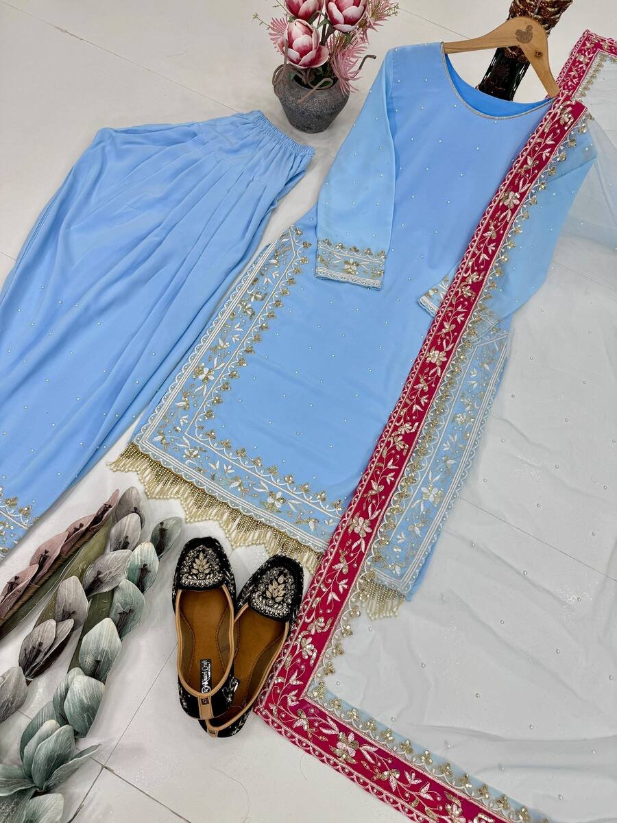 FASHIONABLE DIAMOND GEORGETTE EMBROIDERY SEQUENCE WORK TOP PATIYALA WITH DUPATTA SKY